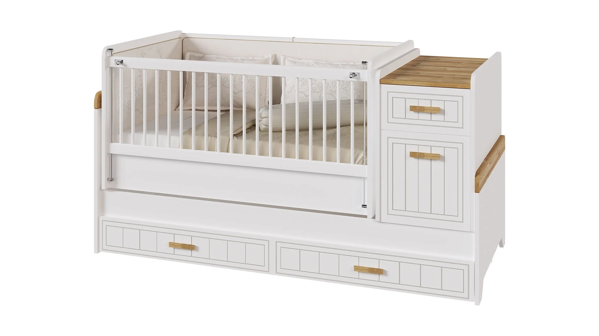 Διαστάσεις Η κούνια Bella για το βρεφικό σας δωμάτιο συνδυάζει την απλότητα με την κομψότητα και ταιριάζει σε κάθε παιδικό δωμάτιο. Το κρεβάτι προσαρμόζεται στις διαφορετικές φάσεις ανάπτυξης του μωρού, χάρη στις ρυθμιζόμενες θέσεις προσφέροντας πρακτικότητα και ευκολία στους γονείς. Η ιδανική απόσταση ανάμεσα στα κάγκελα εξασφαλίζει τη μέγιστη ασφάλεια, ενώ το ενσωματωμένο πλαίσιο και η βάση στρώματος προσφέρουν σταθερότητα και αντοχή.