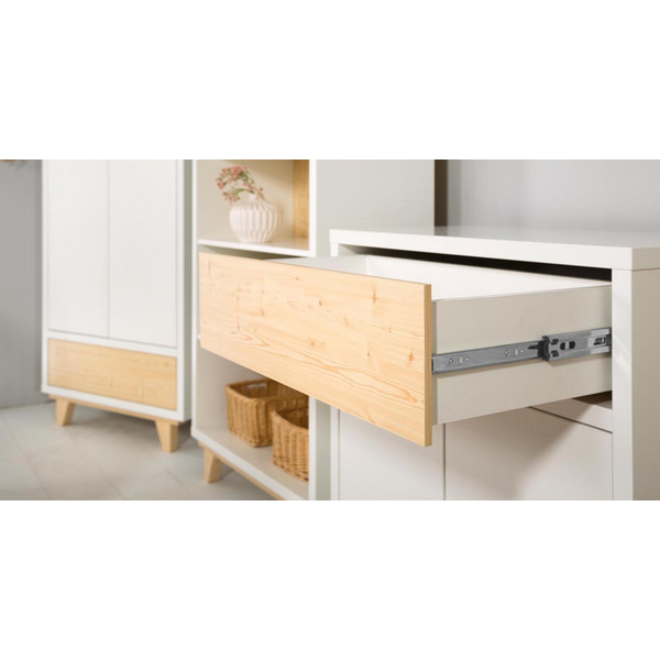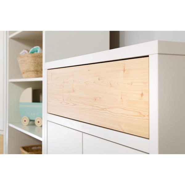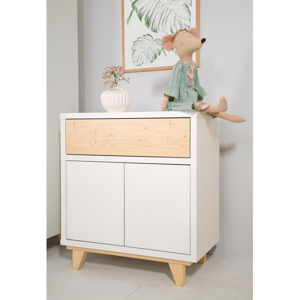 Βρεφική συρταριέρα Lydia Ο χρωματικός συνδυασμός λευκού και πεύκου είναι ιδανικός για κομψούς και άνετους εσωτερικούς χώρους. Ευρύχωρα και λειτουργικά έπιπλα. Η παιδική συρταριέρα Lydia είναι μοντέρνα και εύχρηστη. Διαθέτει: Ένα συρτάρι Ένα ευρύχωρο ντουλάπι με χώρισμα στη μέση Μηχανισμός push to open (άνοιγμα με ένα πάτημα) Χρώμα: λευκό – φυσικό Διαστάσεις: 80 x 45 x 88 εκ.