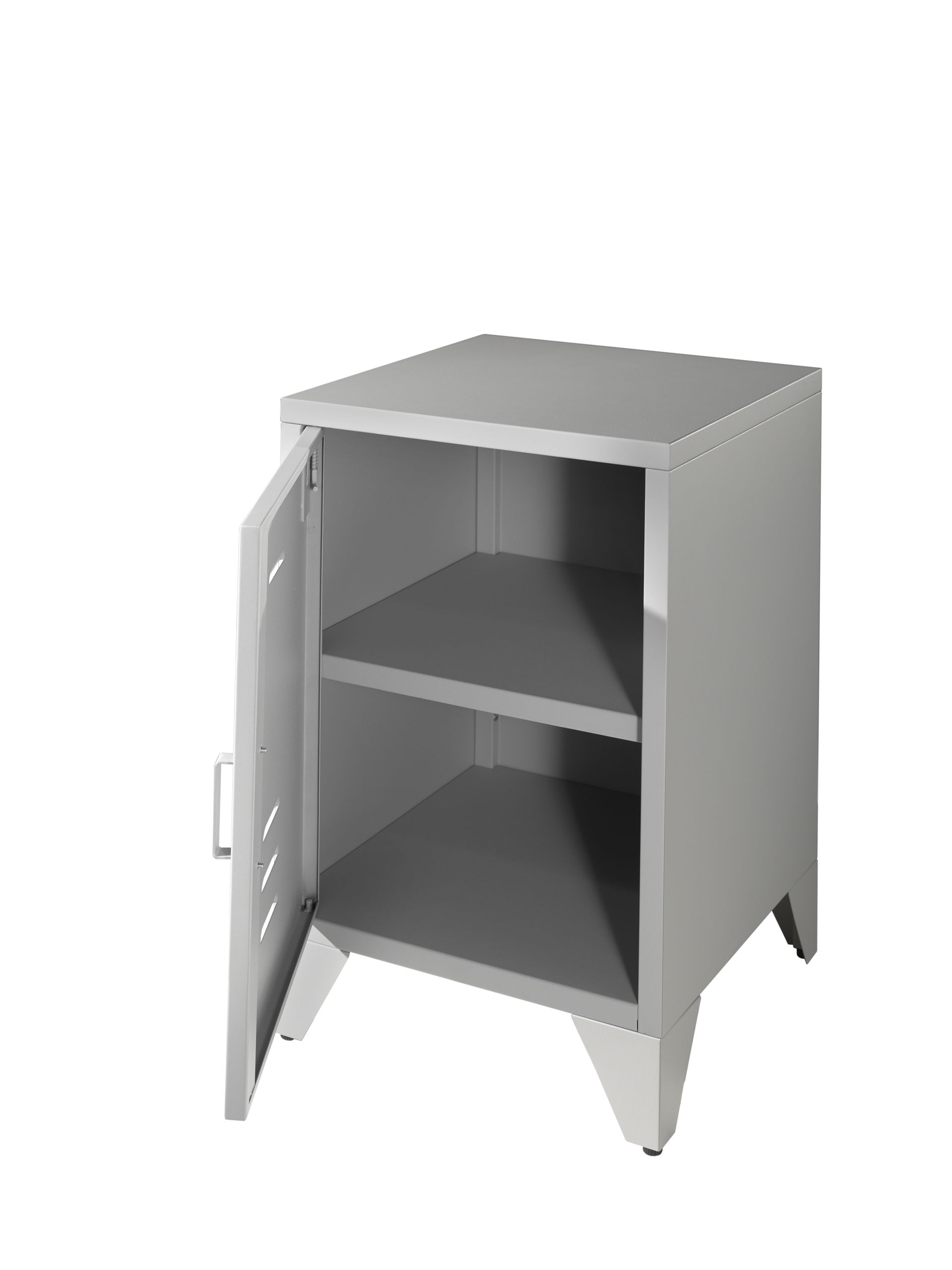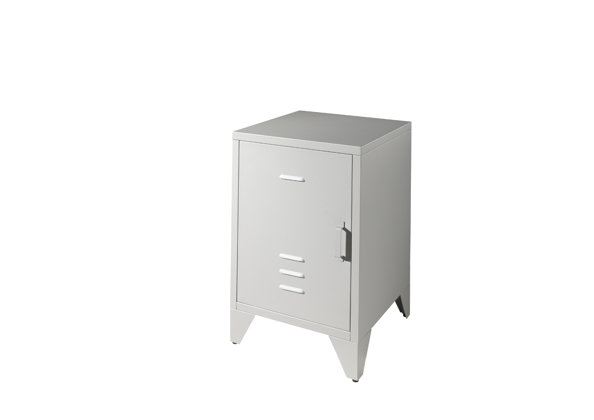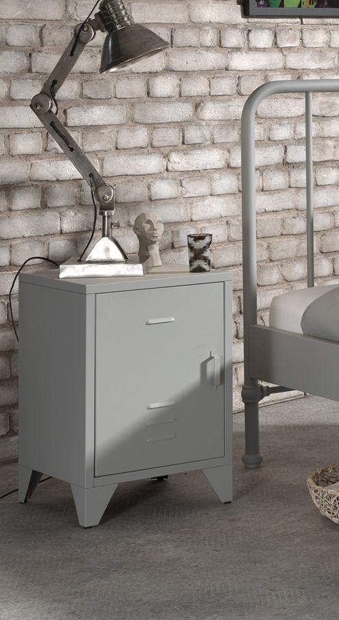 Αυτό το κομοδίνο BRONXX σε Γκρι χρώμα είναι κατασκευασμένο από μέταλλο. Το ματ Γκρι φινίρισμά του δίνει μια βιομηχανική εμφάνιση. Στο εσωτερικό, το κομοδίνο διαθέτει δύο ράφια για την αποθήκευση προσωπικών αντικειμένων.