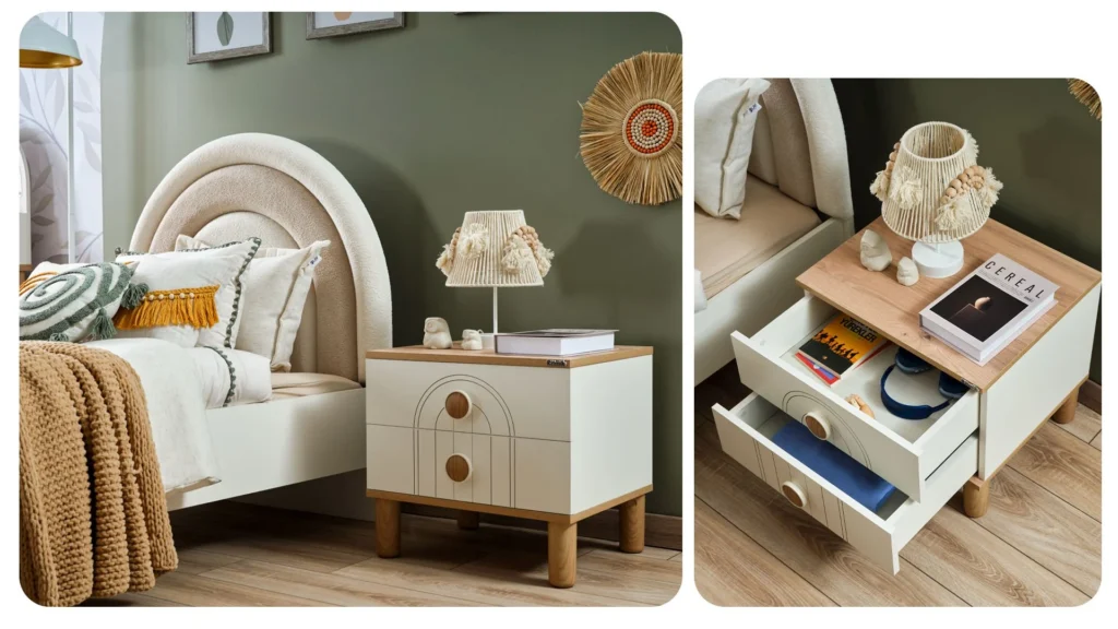 Tο Ροζ κομοδίνο Cool συμπληρώνει τέλεια το ασορτί κρεβάτι αυτής της συλλογής. Είναι κατασκευασμένο από λακαρισμένο MDF και μασίφ πεύκο. Έχει στρογγυλεμένες άκρες και μία πόρτα για την αποθήκευση προσωπικών αντικειμένων.