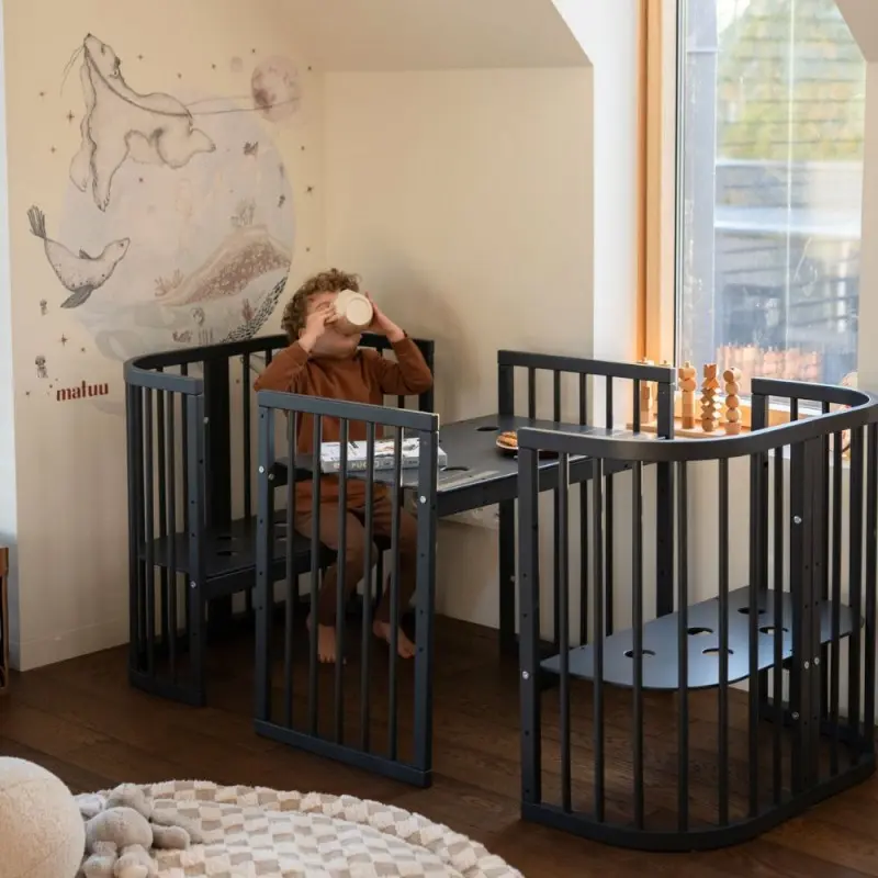 Το έπιπλο μπορεί επίσης να λειτουργήσει ως χώρος μάθησης ή παιχνιδιού. Μπορείτε να το μετατρέψετε σε ένα άνετο σετ τραπεζιού και δύο καρεκλών. Το ύψος των καθισμάτων και του τραπεζιού μπορεί να ρυθμιστεί, ώστε να δημιουργηθεί μια ιδανική γωνιά για το παιδί.