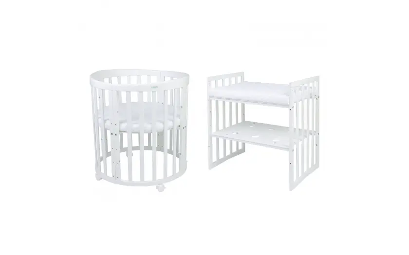 7-σε-1 οβάλ βρεφικό κρεβάτι Το 7-σε-1 οβάλ βρεφικό κρεβάτι είναι πρακτικό, κομψό και ανθεκτικό. Αποτελεί μια επιλογή που θα διαρκέσει για πολλά χρόνια – θα εξυπηρετήσει το παιδί σας από τη στιγμή της γέννησής του μέχρι να γίνει 10 ετών ή και περισσότερο, ανάλογα με την ανάπτυξή του. Είναι κατασκευασμένο από προσεκτικά επιλεγμένα υλικά και εγγυάται την ασφάλεια και την άνεση του μωρού σας. Τεχνικά χαρακτηριστικά: Μικρό οβάλ κρεβάτι: Υ 81 εκ., Π 78 εκ., Μ 78 εκ. Μεγάλο οβάλ κρεβάτι: Υ 81 εκ., Π 78 εκ., Μ 128,5 εκ. Ρυθμιζόμενο ύψος δαπέδου σε 5 επίπεδα: 12 εκ., 24 εκ., 35 εκ., 47 εκ., και 55 εκ. Στρώμα 3 τμημάτων με βαμβακερά καλύμματα. Τα καλύμματα μπορούν να πλυθούν στους 30 βαθμούς Κελσίου.