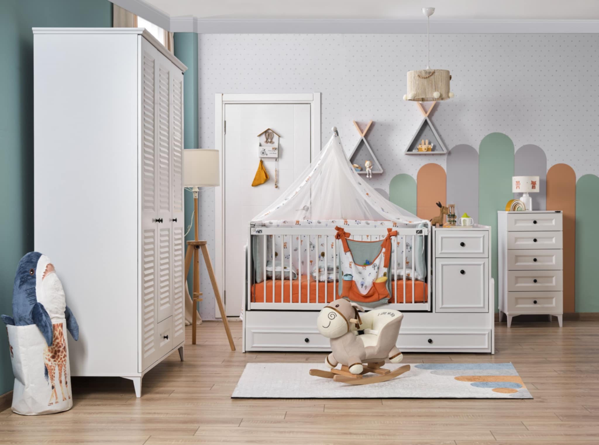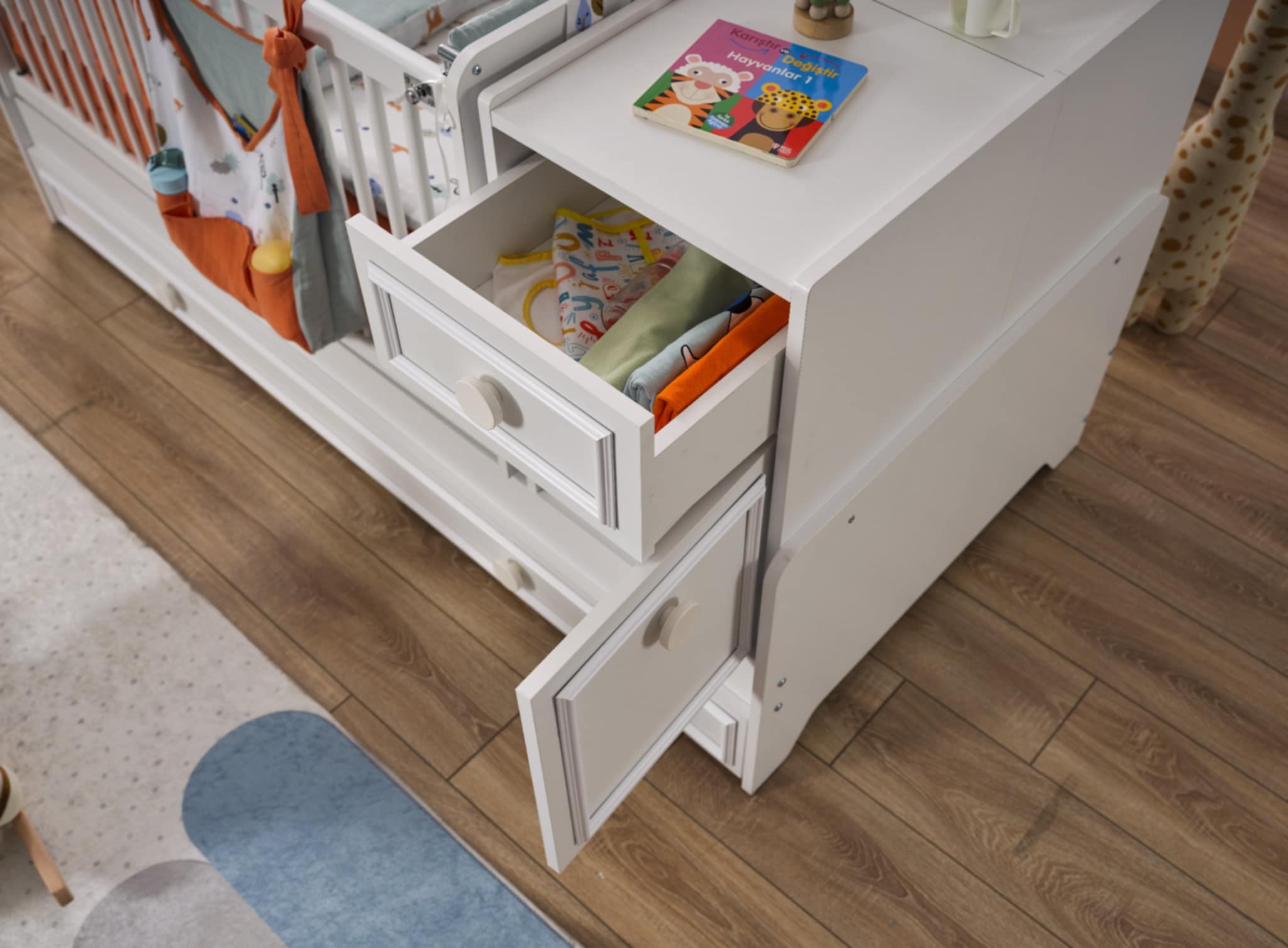 Επιπλέον, διαθέτει συρόμενο δεύτερο κρεβάτι 170 x 80 εκ., ιδανικό για φιλοξενία ή αδερφάκι. Τα ντουλάπια της κούνιας μετατρέπονται σε κομοδίνα, προσφέροντας ένα πλήρως λειτουργικό και αρμονικό σετ επίπλων.