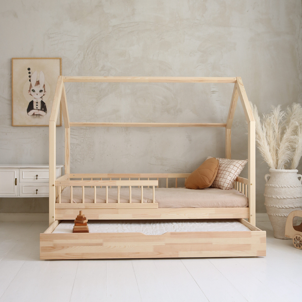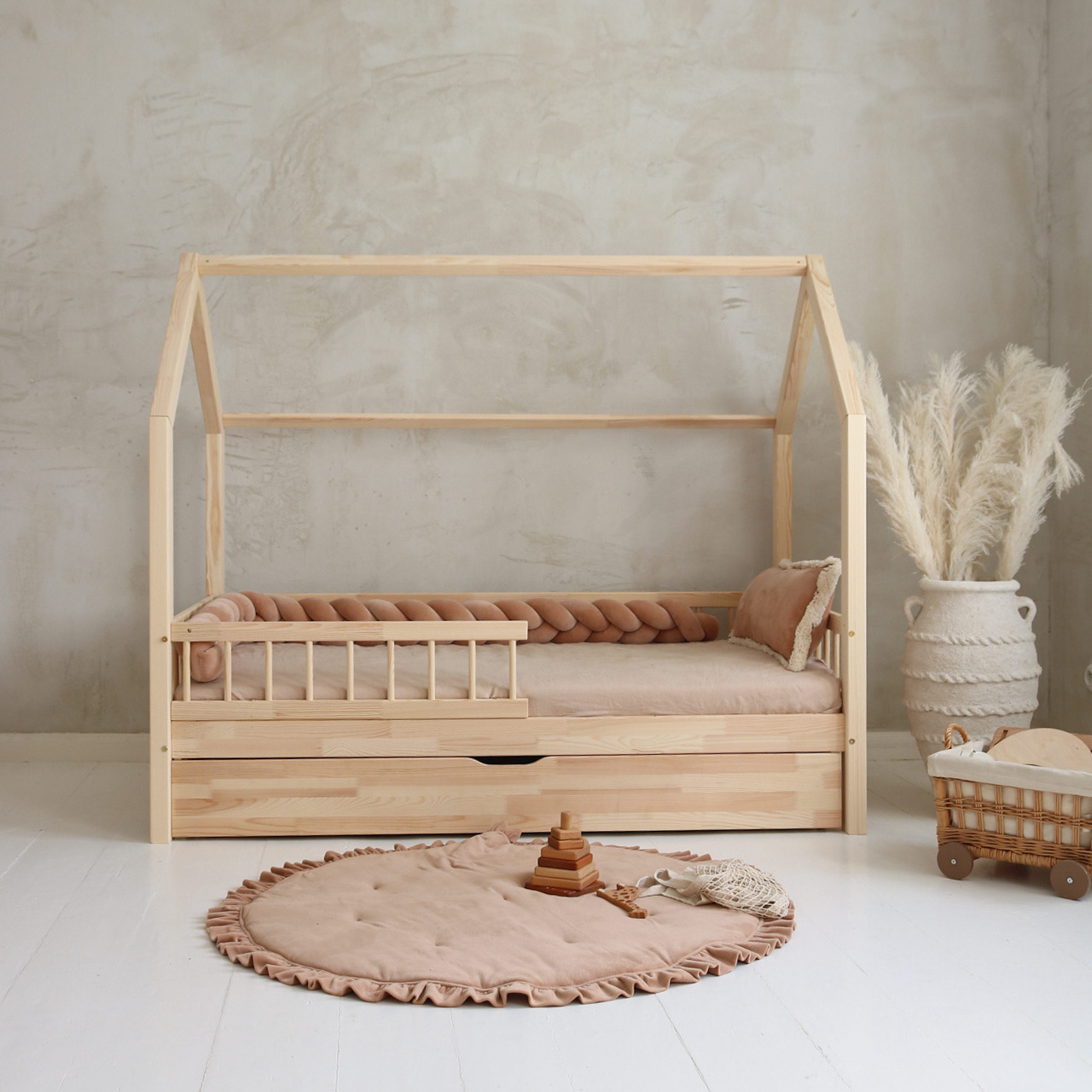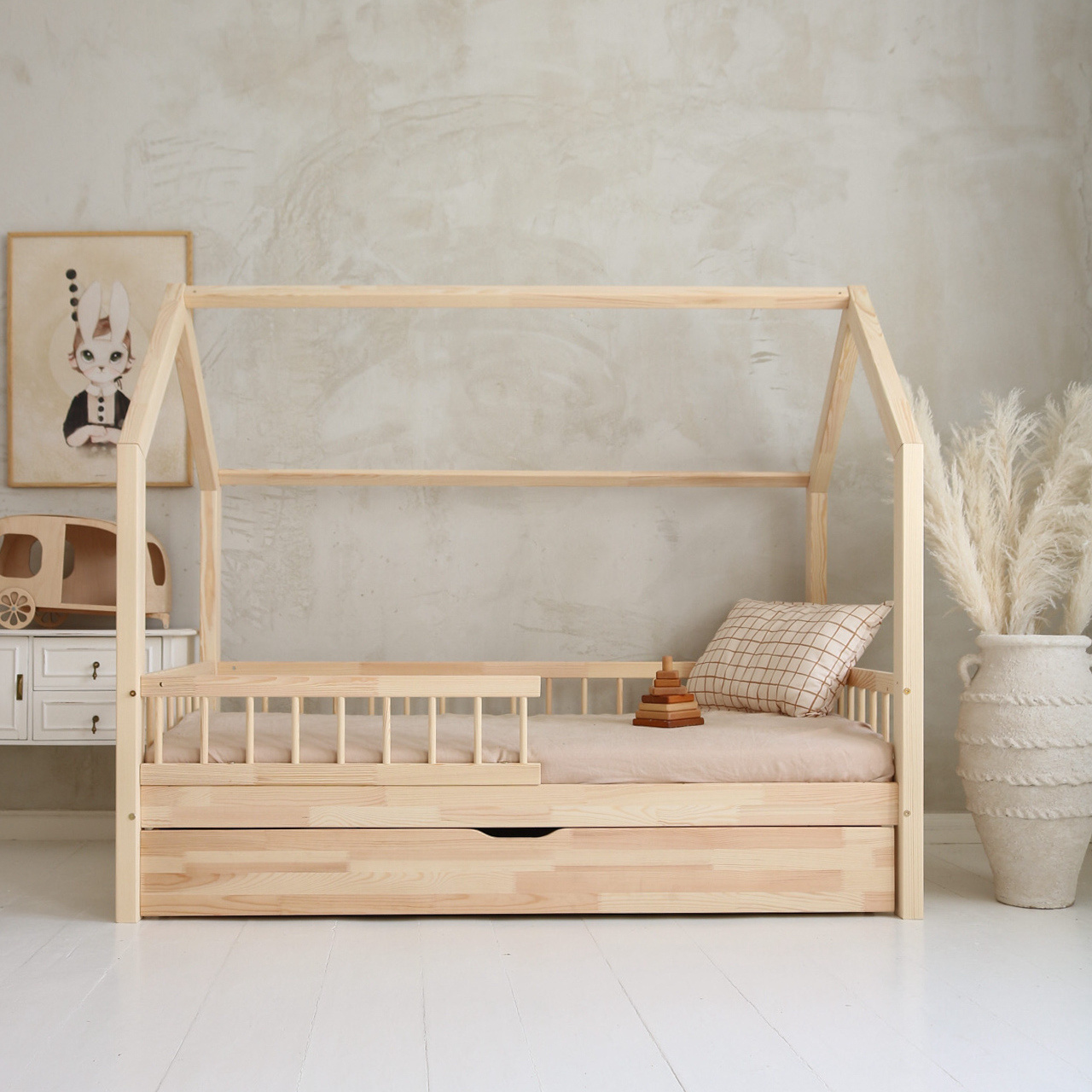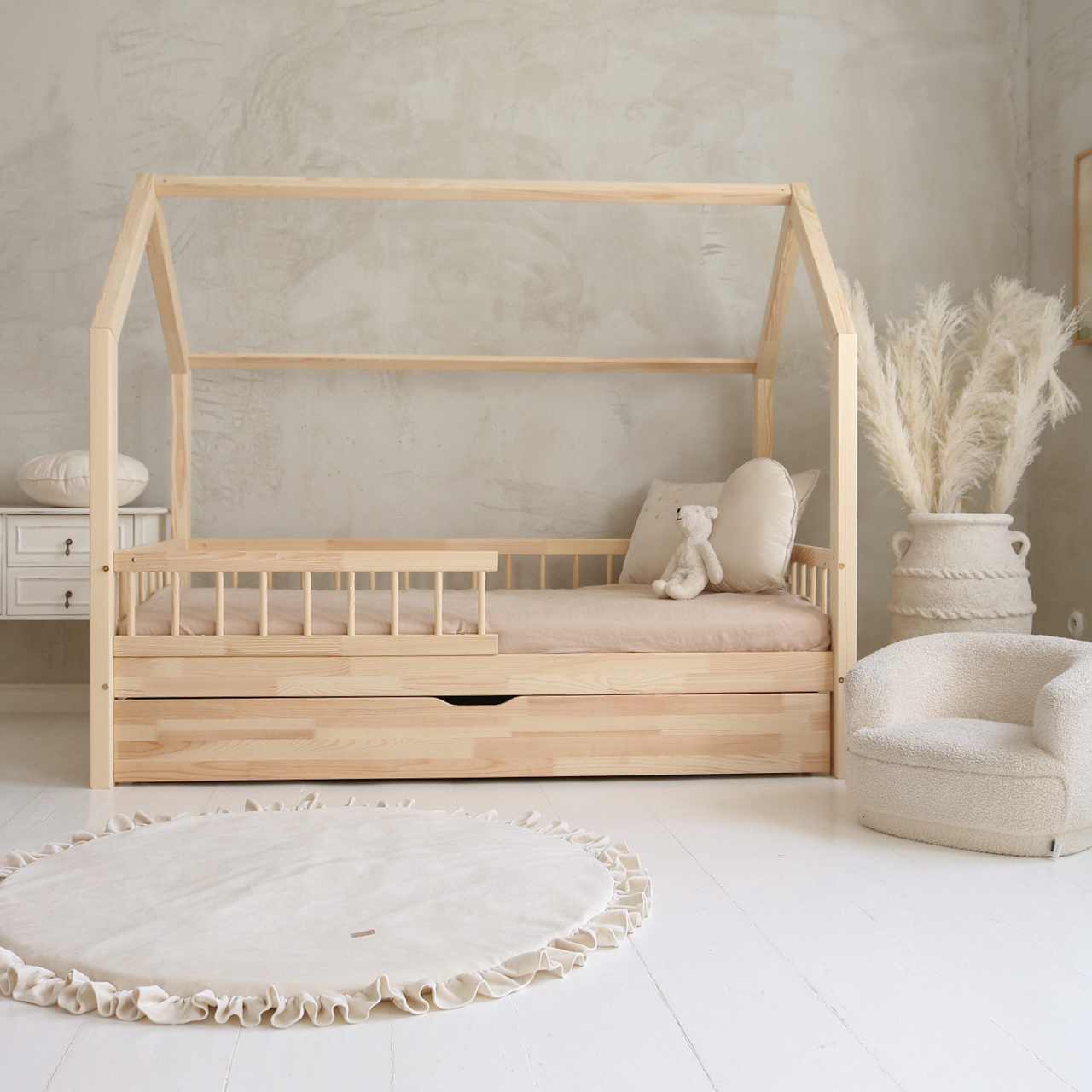 Το BELLO PLUS είναι ένα παιδικό κρεβάτι σε σχήμα σπιτιού, με κομψό σκανδιναβικό design και ενσωματωμένο συρτάρι ή συρτάρια. Πλήρες πλαίσιο κρεβατιού με βάση για στρώμα Κάθετες δοκοί & μίνι σκεπή Συρτάρι ή συρτάρια αποθήκευσης Μπροστινό αποσπώμενο κάγκελο Πλήρες σετ προστατευτικών καγκελών (όπως στις φωτογραφίες) Όλα τα υλικά συναρμολόγησης Βίδες και οικολογική κόλλα νερού (για συγκόλληση των ξύλινων ενώσεων με καβίλιες)