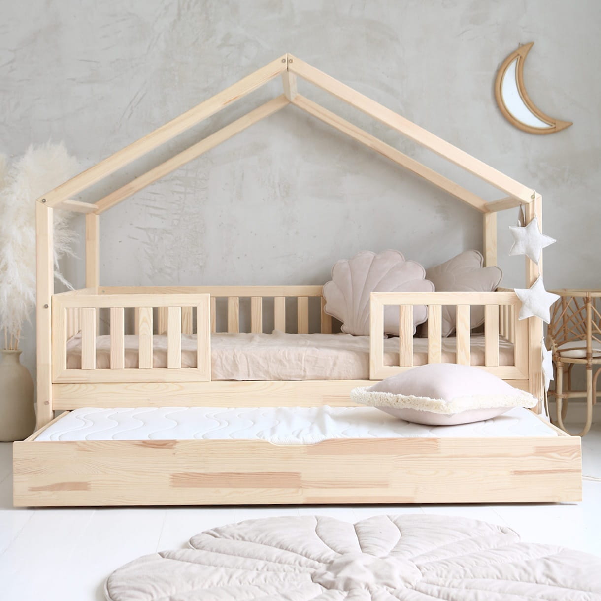 Το HOUSEBED DUO PLUS FENCE RAIL είναι ένα παιδικό κρεβάτι σε σκανδιναβικό στυλ, με κάγκελα ασφαλείας και συρτάρι ή συρτάρια. Περιλαμβάνει ολόκληρο το πλαίσιο του κρεβατιού, βάση για στρώμα, κάθετες κολόνες, μίνι-σκεπή και όλα τα κάγκελα που απεικονίζονται στις φωτογραφίες. Περιλαμβάνονται: Όλα τα μέρη του κρεβατιού Βίδες και οικολογική κόλλα νερού για την ένωση των ξύλινων εξαρτημάτων Συρτάρι ή συρτάρια ανάλογα με την επιλογή Οδηγίες συναρμολόγησης Κατασκευάζεται από υψηλής ποιότητας πρώτης κατηγορίας κόντρα πλακέ πεύκου Πιο ανθεκτικό από το μασίφ ξύλο – δεν ραγίζει και δεν έχει ρόζους Όλα τα εξαρτήματα είναι λειασμένα στο χέρι ή μηχανικά με στρογγυλεμένες άκρες Περιλαμβάνεται στη τιμή Αποτελείται από ελαστικές τάβλες που τοποθετούνται ανεξάρτητα σε υποδοχές Στις διαστάσεις 200×120 και 200×140, η βάση είναι επίπεδη, με τάβλες από μασίφ ξύλο με ρόζους To κρεβάτι παραδίδεται αμοντάριστο σε κουτιά με αναλυτικές οδηγίες συναρμολόγησης. Υπάρχει δυνατότητα συναρμολόγησης με επιπλέον κόστος.