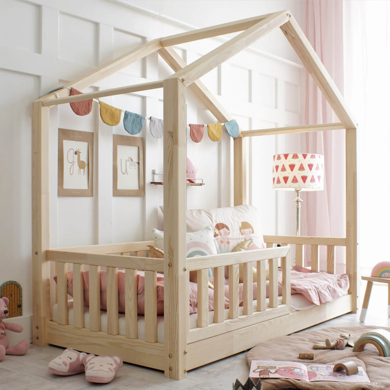 Το Housebed Fence Montessori είναι ένα μοναδικό παιδικό κρεβάτι σκανδιναβικού στιλ, κατασκευασμένο από μασίφ ξύλο πεύκου με επικόλληση κόλλας.