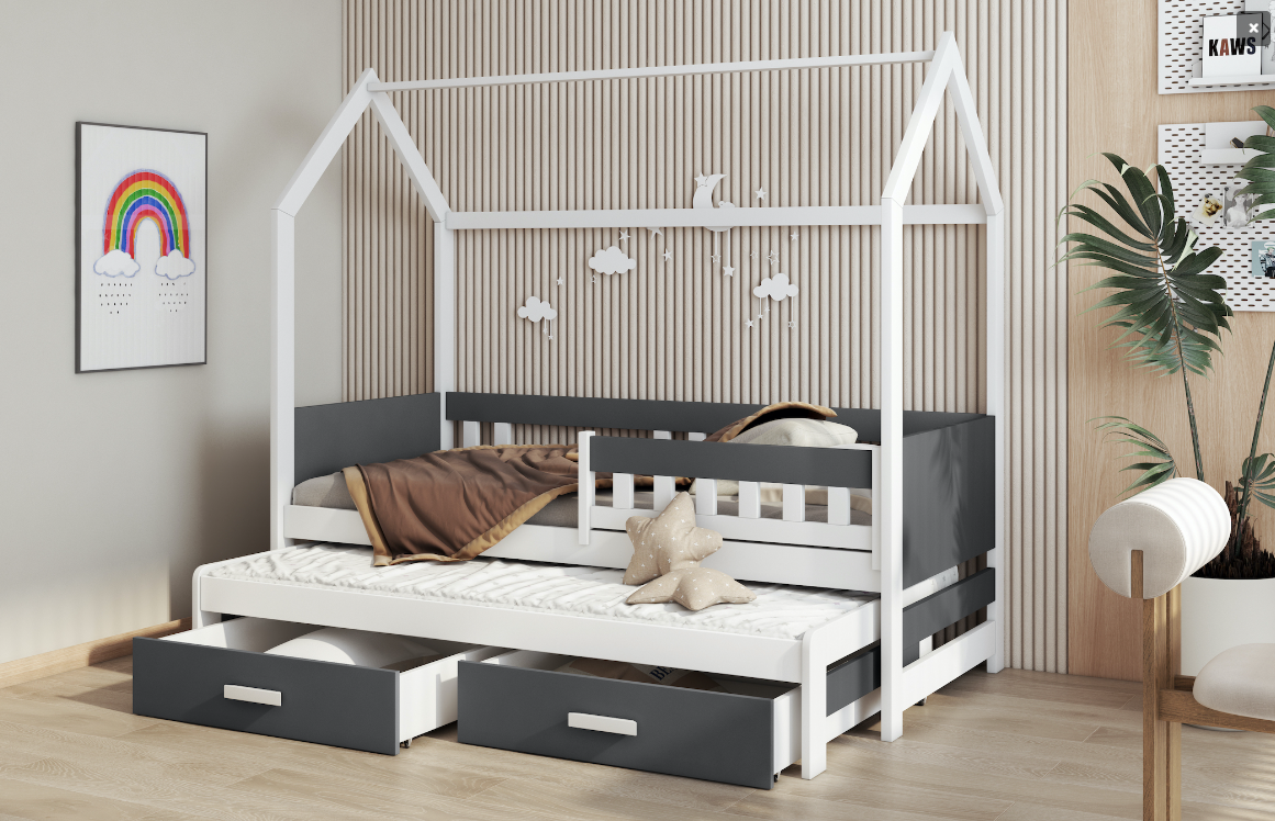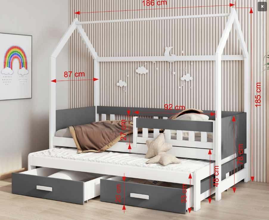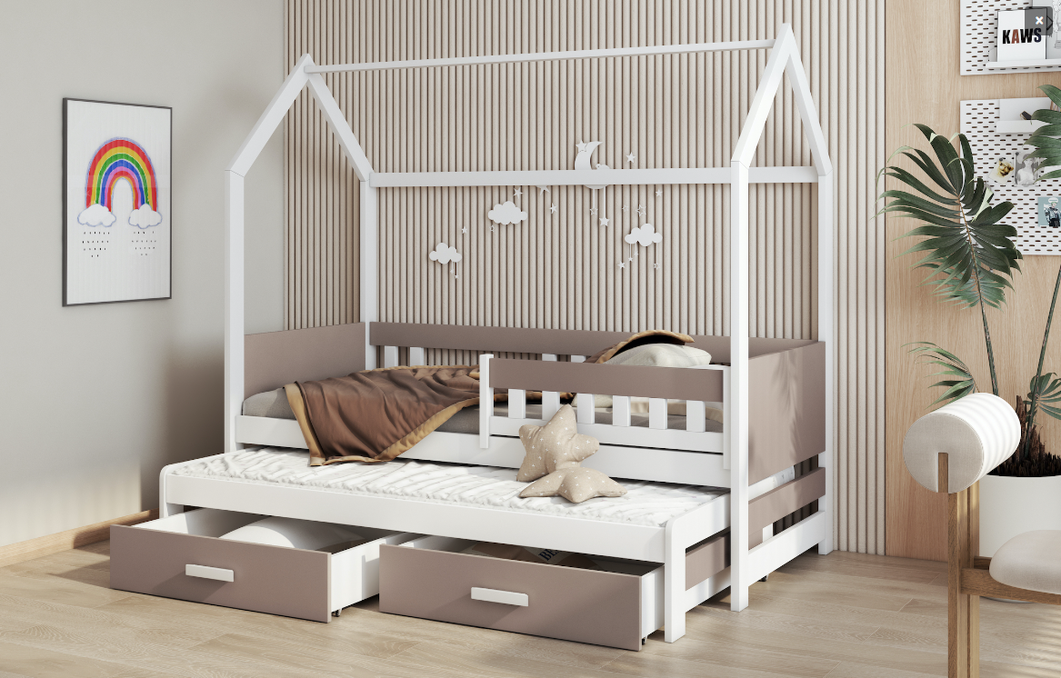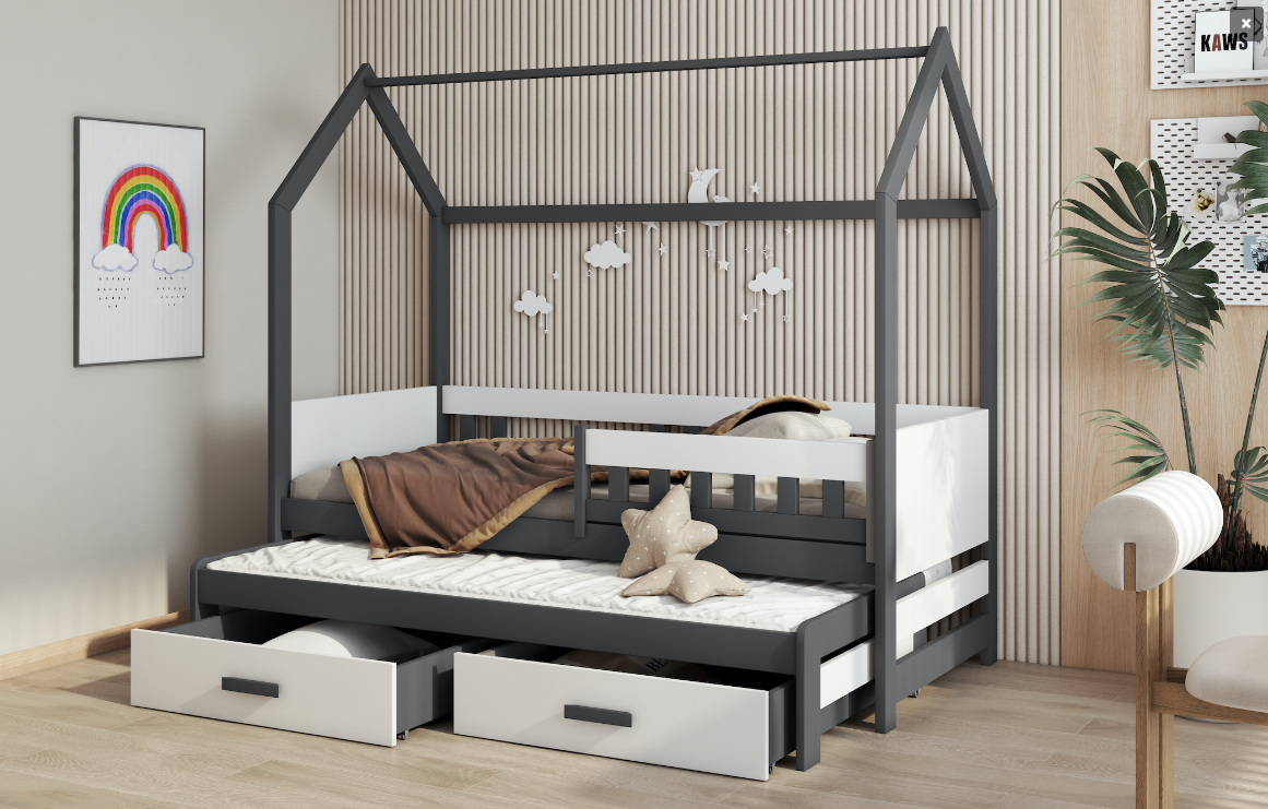 Το JASPER είναι ένα μοντέρνο κρεβάτι με συρτάρια σε σχήμα σπιτιού! Διαθέτει όμορφο προστατευτικό κάγκελο που καλύπτει το 1/2 της πρόσοψης του κρεβατιού! Περιλαμβάνονται: – Το στρώμα δεν περιλαμβάνεται (πωλείται ξεχωριστά) Προσοχή: Διαστάσεις στρώματος: 167/80εκ. (για το συρόμενο κρεβάτι), για το κρεβάτι 180/80εκ. Προσοχή: Διαστάσεις στρώματος: 177/90εκ. (για το συρόμενο κρεβάτι), για το κρεβάτι 190/90εκ. Προσοχή: Διαστάσεις στρώματος: 187/90εκ. (για το συρόμενο κρεβάτι), για το κρεβάτι 200/90εκ. Προσοχή: Διαστάσεις στρώματος: 187/100εκ. (για το συρόμενο κρεβάτι), για το κρεβάτι 200/100εκ.