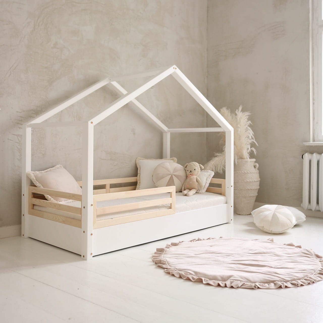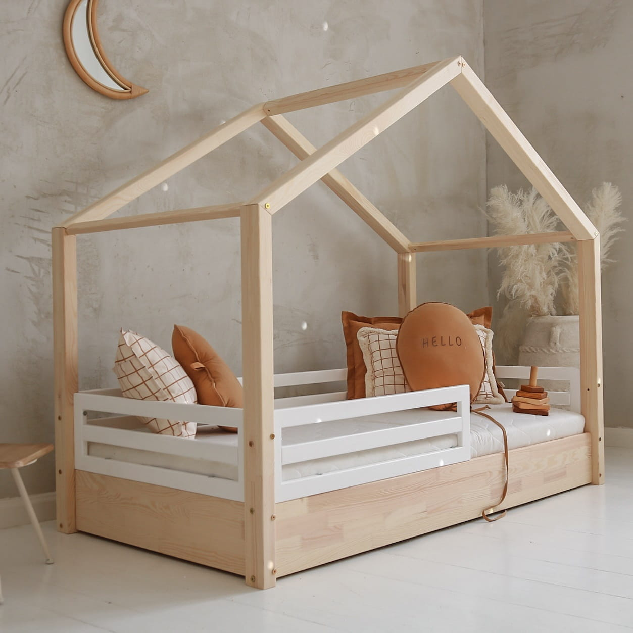 Αγοράζοντας το NEW HOUSEBED FELLO, αποκτάτε ένα πλήρες πλαίσιο κρεβατιού με βάση για στρώμα, κάθετες δοκούς, μίνι-στέγη και το προστατευτικό καγκελάκι που φαίνεται στις φωτογραφίες.