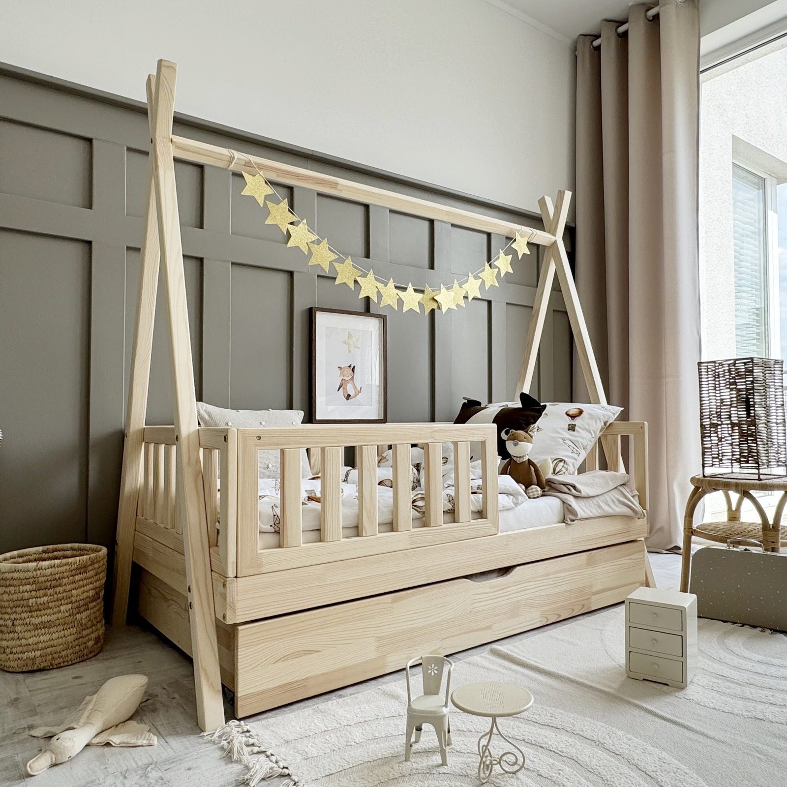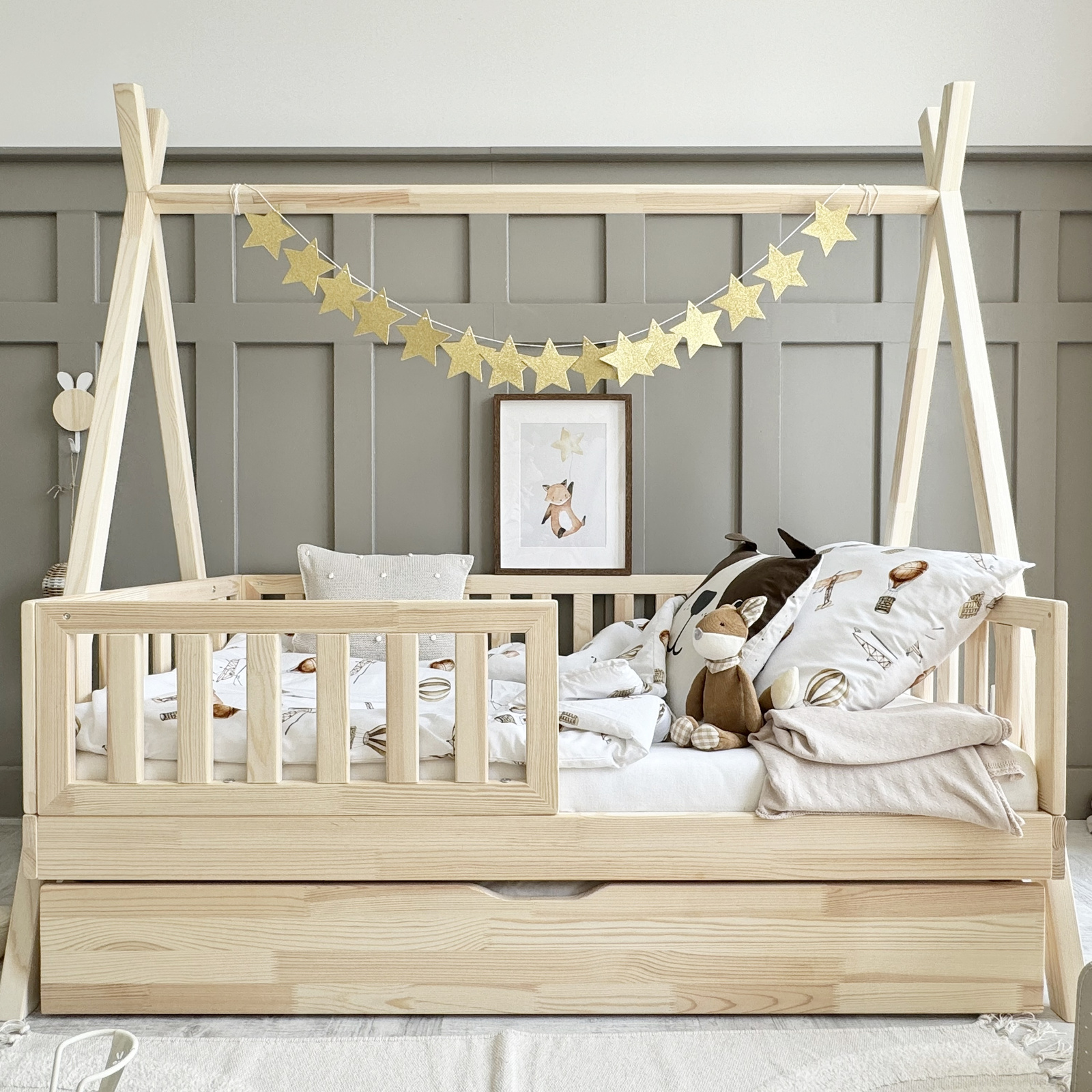 Tipi PLUS with fence rail παιδικό κρεβάτι φυσικό ξύλο μασίφ με συρτάρι / δεύτερο κρεβάτι