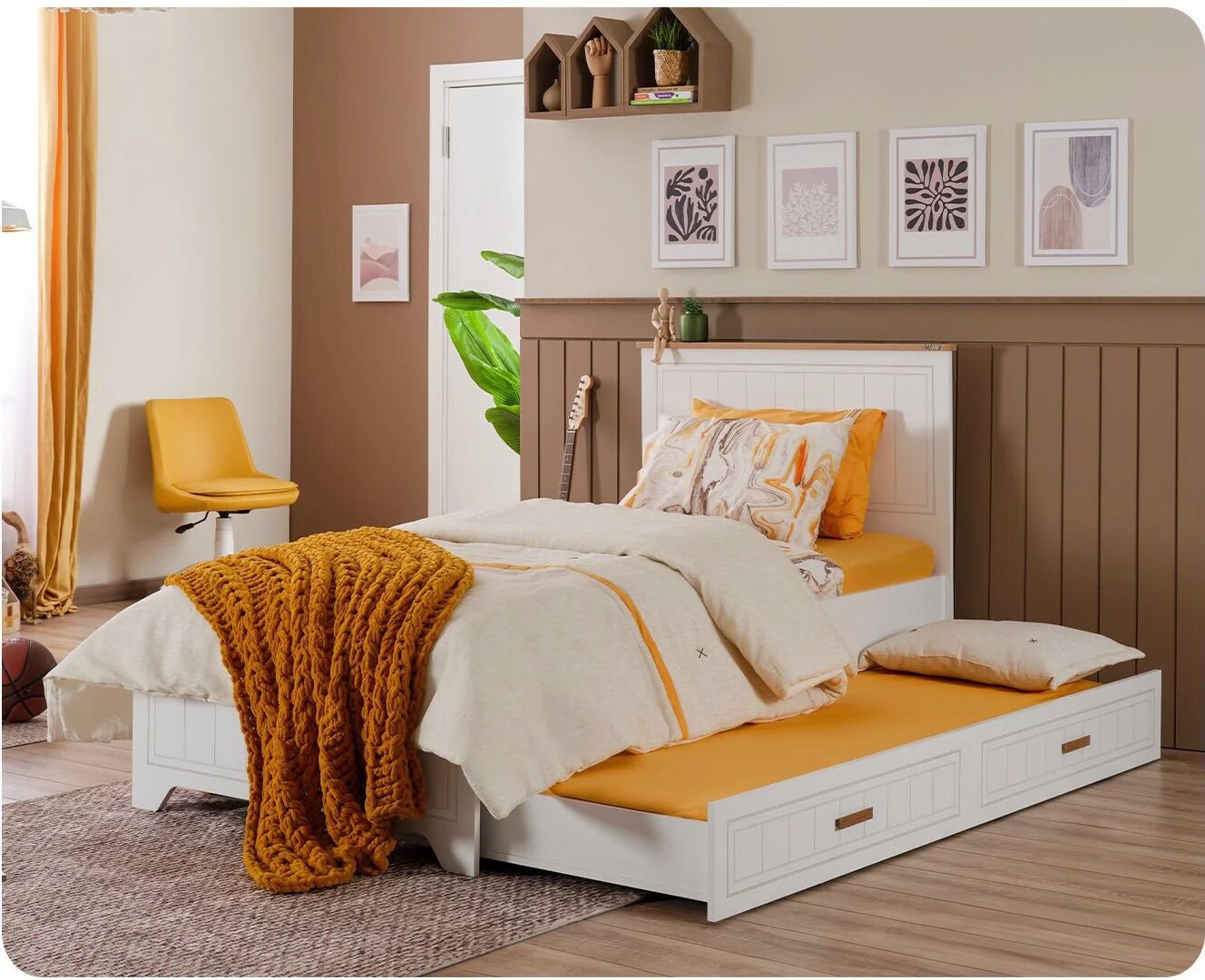 Ένα κομψό και λειτουργικό κρεβάτι που συνδυάζει στιβαρή κατασκευή με πρακτικότητα, ιδανικό για το παιδικό ή νεανικό δωμάτιο. Διαθέτει επιπλέον συρόμενο κρεβάτι που ανοίγει εύκολα, προσφέροντας λύση φιλοξενίας και εξοικονόμηση χώρου.