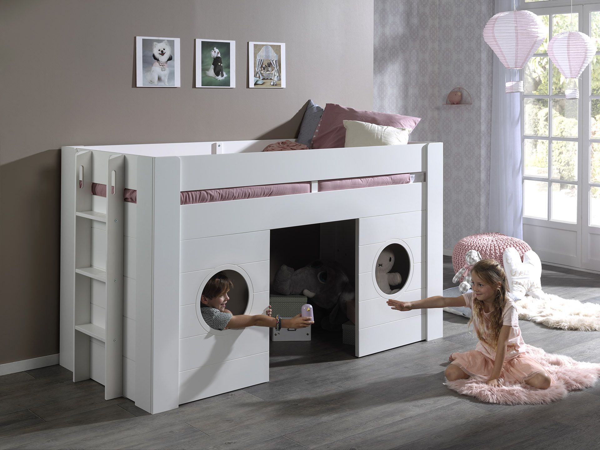 Το κρεβάτι μεσαίου ύψους FREYA (90 x 200 εκ.) σε λευκό χρώμα είναι κατασκευασμένο από υψηλής ποιότητας λακαρισμένο MDF. Ο χώρος κάτω από το κρεβάτι είναι πολυλειτουργικός και μπορεί να χρησιμοποιηθεί ως γωνιά παιχνιδιού ή ανάγνωσης ή ως αποθηκευτικός χώρος. Τα στρογγυλά, ανοιχτά παράθυρα δίνουν στο κρεβάτι μια παιχνιδιάρικη εμφάνιση. Η σκάλα μπορεί να τοποθετηθεί είτε στην αριστερή είτε στη δεξιά πλευρά του κρεβατιού.