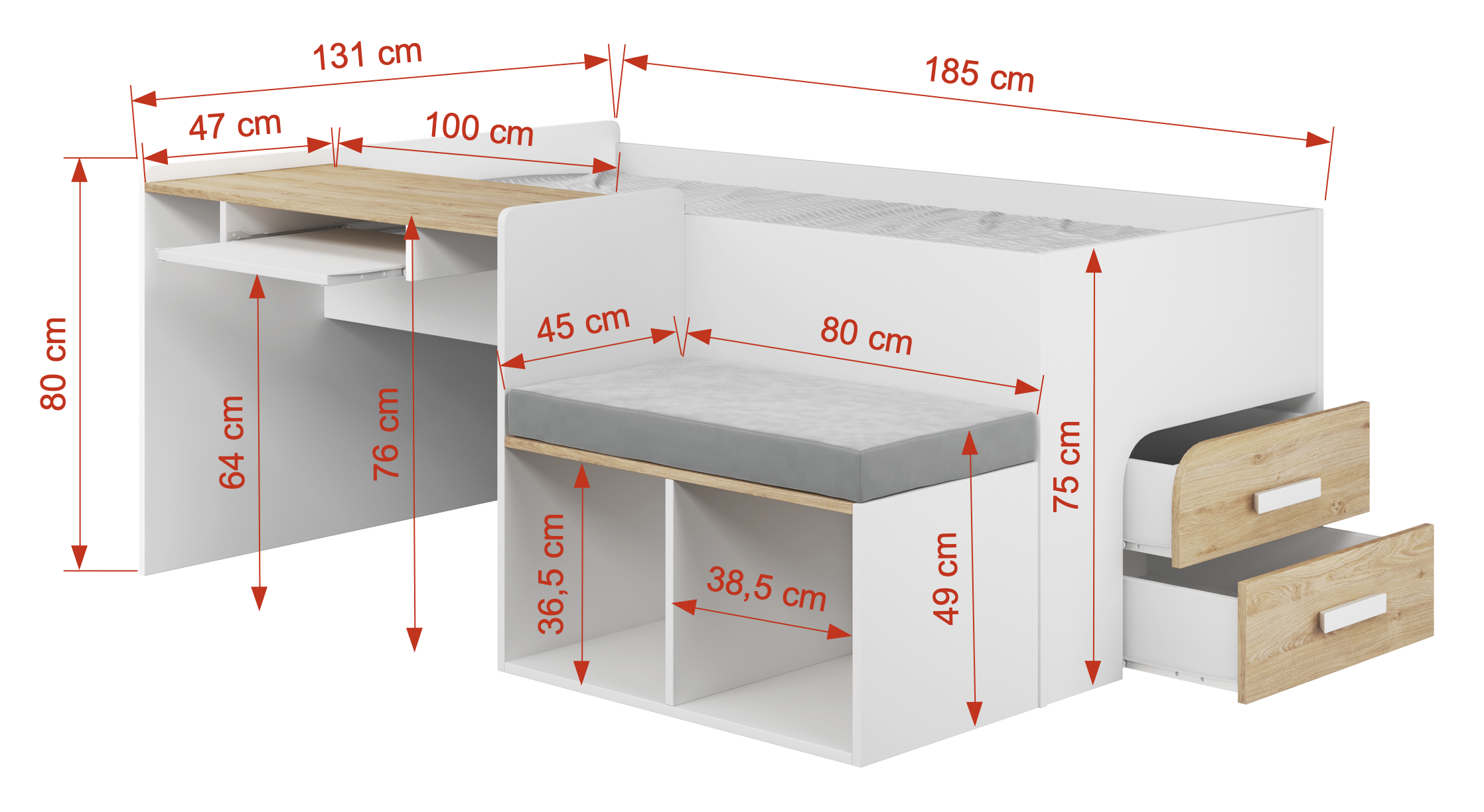 Ψάχνετε για μια πρακτική λύση για το δωμάτιο ενός παιδιού ή ενός εφήβου; Το κρεβάτι Megan με γραφείο είναι η ιδανική λύση για μικρούς χώρους όπου κάθε εκατοστό χώρου μετράει. Αυτό το πολυλειτουργικό έπιπλο συνδυάζει μια άνετη θέση ύπνου με ένα εργονομικό γραφείο και χώρο εργασίας. Ένα επιπλέον πλεονέκτημα είναι τα ευρύχωρα συρτάρια , τα οποία παρέχουν επιπλέον αποθηκευτικό χώρο.