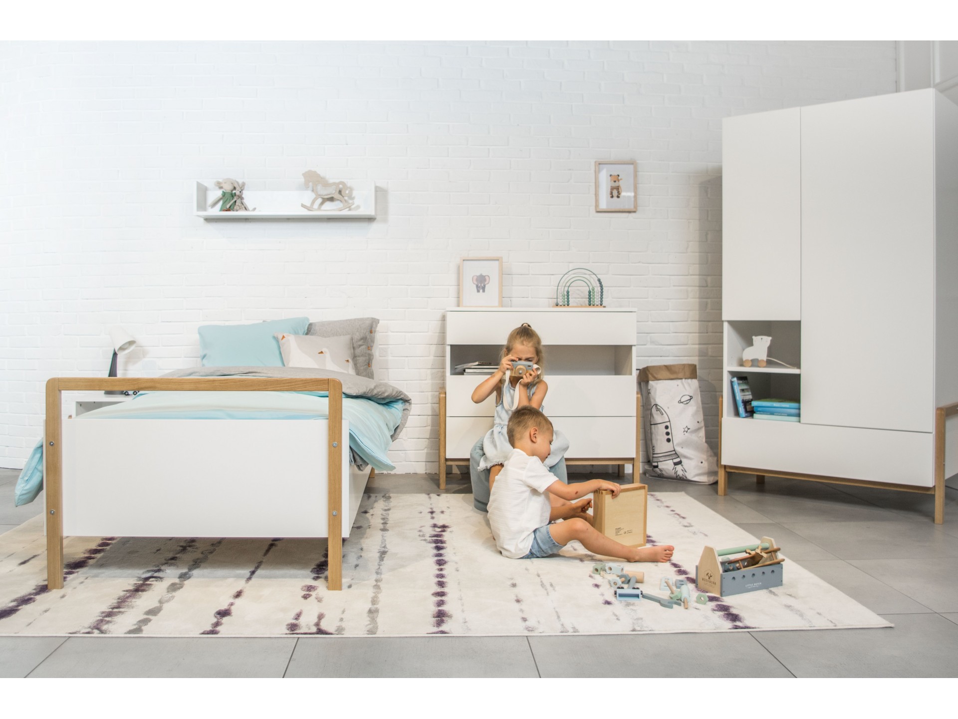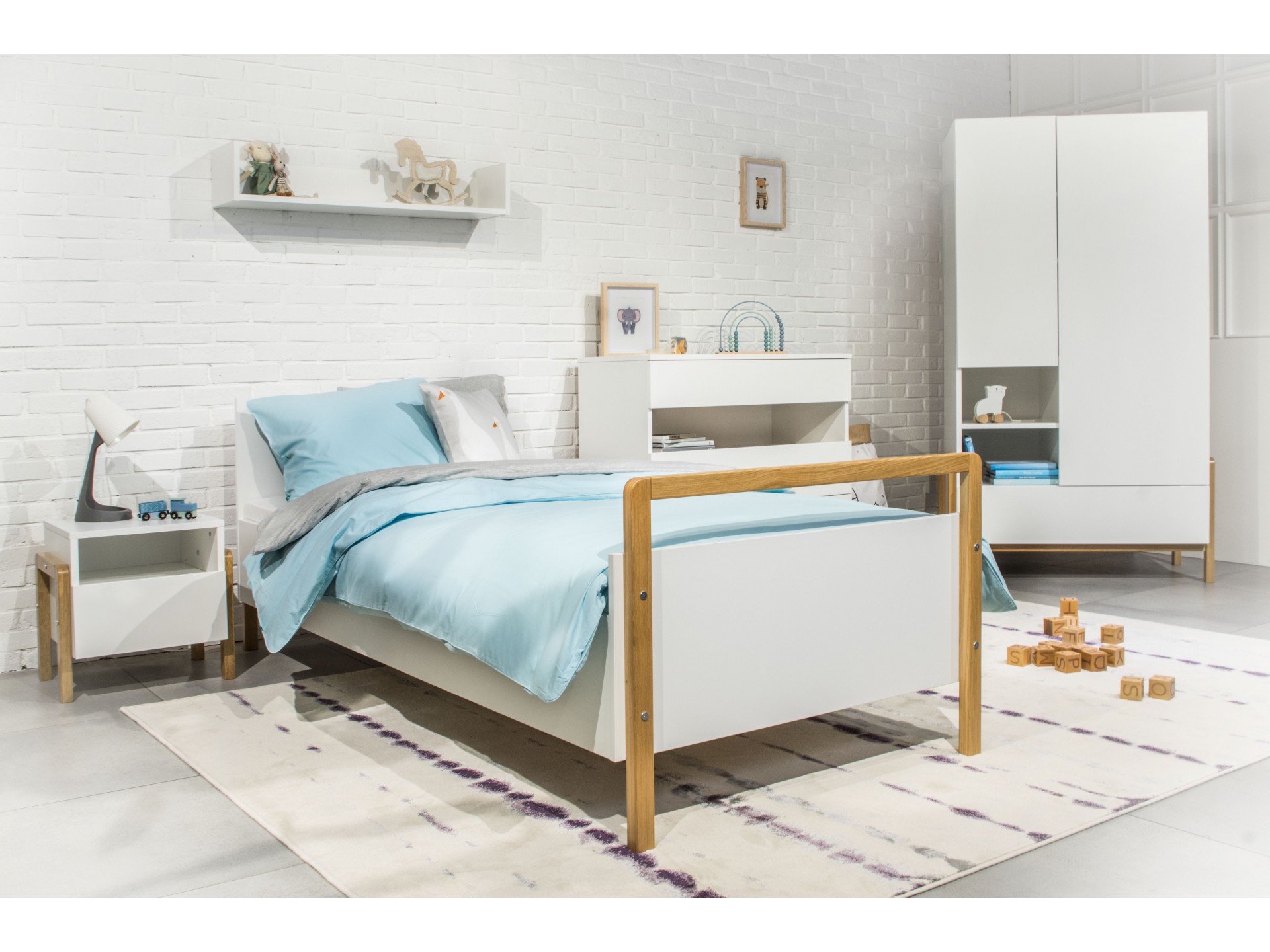 Το κρεβάτι Victor, κατασκευασμένο από ξύλο δρυός και λευκό mdf, ταιριάζει στις τάσεις του σκανδιναβικού στυλ. Η φυσικότητα των στοιχείων σας επιτρέπει να δημιουργήσετε ένα μοντέρνο και λειτουργικό παιδικό δωμάτιο. Τα έπιπλα της συλλογής Victor έχουν σχεδιαστεί με γνώμονα την άνεση του παιδιού – εφήβου. Η πρωτότυπη δομή τους και το μοναδικό τους χρώμα καθιστούν το καθένα από αυτά μοναδικό . Το κρεβάτι έχει απλό και εργονομικό σχεδιασμό, ο οποίος παρέχει ένα ιδανικό περιβάλλον για χαλάρωση. Το βασικό υλικό του κρεβατιού είναι πιστοποιημένο, πάχους 18 mm, πλαστικοποιημένο μοριοσανίδα με λευκό φινίρισμα. Τα υπερυψωμένα δρύινα πόδια και το προσκέφαλο είναι στοιχεία που εγγυώνται άνεση και μια ανάσα δροσιάς. Ο σκελετός του κρεβατιού Victor είναι κατασκευασμένος από πηχάκια φυσικής σημύδας. Ένα πρόσθετο πλεονέκτημα είναι η χρήση μακρών σανίδων που συνδέονται στο κάτω μέρος με σύνδεσμο, ο οποίος ενισχύει ολόκληρη τη δομή. Για άνετη συναρμολόγηση, το κρεβάτι συνοδεύεται από εικονογραφημένες οδηγίες.