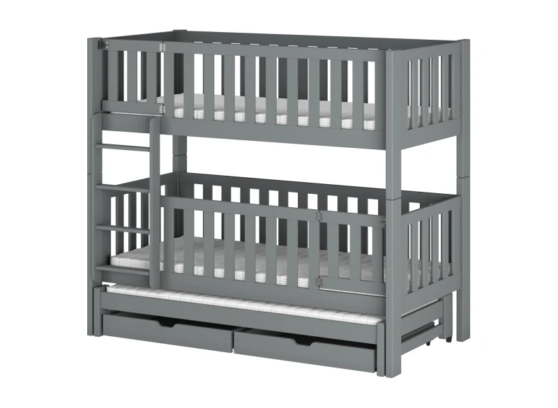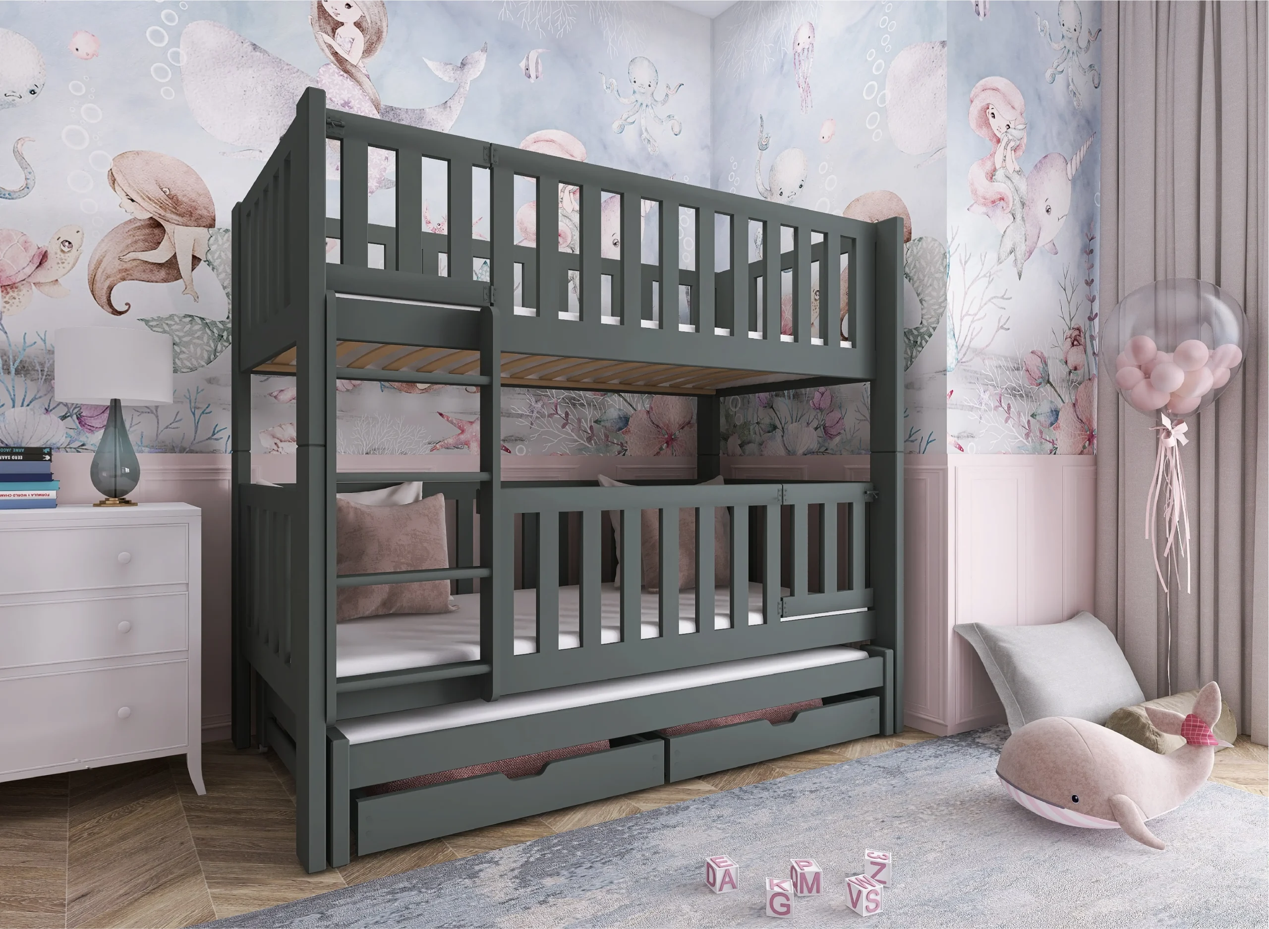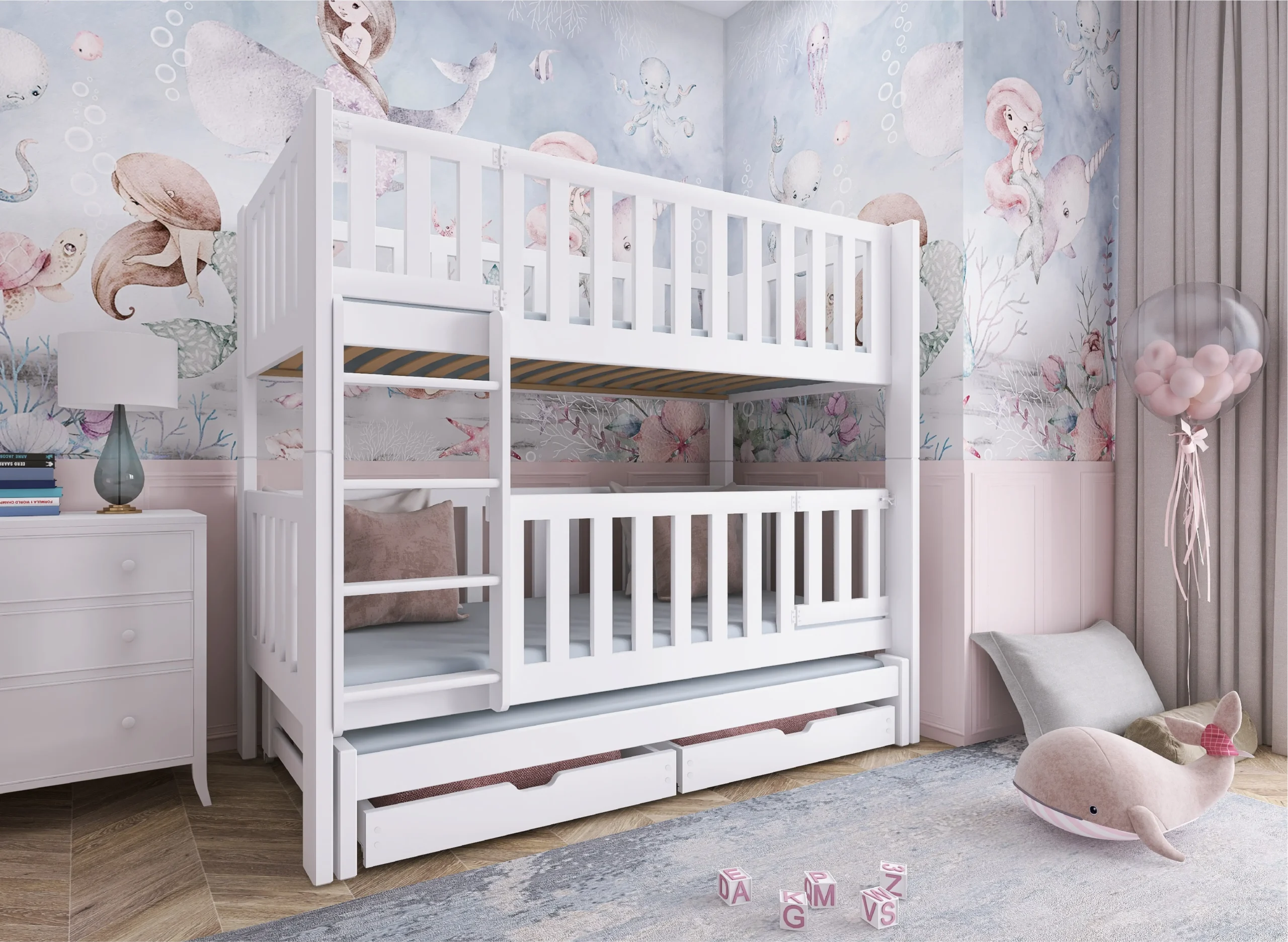 Αναζητάτε λύση για ένα λειτουργικό και όμορφο παιδικό δωμάτιο; Η ξύλινη κουκέτα AGATHA είναι η τέλεια επιλογή! Φτιαγμένο με προσοχή στη λεπτομέρεια και με υλικά υψηλής ποιότητας, το AGATHA εξασφαλίζει έναν ήρεμο και υγιεινό ύπνο. Ο κλασικός σχεδιασμός του ταιριάζει ιδανικά σε κάθε παιδικό δωμάτιο – αγοριών ή κοριτσιών. Η κουκέτα AGATHA είναι κατάλληλη για τρία παιδιά – περιλαμβάνει συρόμενο τρίτο κρεβάτι, καθιστώντας το εξαιρετική επιλογή για αδέλφια ή φιλοξενία φίλων. Η κατασκευή του από φυσικό πεύκο, οι ασφαλείς βαφές και η δυνατότητα αφαίρεσης των προστατευτικών κάγκελων το καθιστούν ασφαλές και πρακτικό για καθημερινή χρήση και παιχνίδι. ✅ 3 θέσεις ύπνου σε έναν μοντέρνο σχεδιασμό ✅ 100% φυσικό ξύλο πεύκου, φιλικό για αλλεργικούς και μαλακό στην αφή ✅ Προαιρετικά αφαιρούμενα προστατευτικά κάγκελα για ευελιξία χρήσης ✅ Συρόμενο τρίτο κρεβάτι – ιδανικό για αδέλφια ή επισκέπτες ✅ Ευρύχωρα συρτάρια για παιχνίδια ή λευκά είδη ✅ Δυνατότητα μετατροπής σε δύο μονά κρεβάτια ✅ Προαιρετική αύξηση κάθετου ύψους (προέκταση) για μεγαλύτερη άνεση και χώρο ✅ Πιστοποιήσεις FSC & REACH, απόλυτα ασφαλές και οικολογικό προϊόν ✅ Εύκολο στη συναρμολόγηση, με επιλογή υποστήριξης από την ομάδα μας