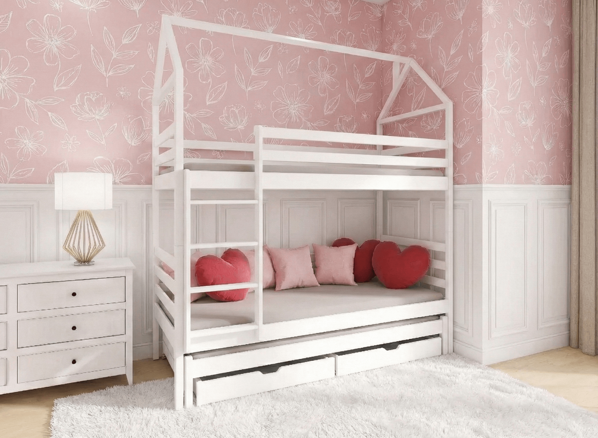 Η κουκέτα DALIA είναι κατάλληλη για τρία παιδιά – περιλαμβάνει συρόμενο τρίτο κρεβάτι, καθιστώντας το εξαιρετική επιλογή για αδέλφια ή φιλοξενία φίλων. Η κατασκευή του από φυσικό πεύκο, οι ασφαλείς βαφές και η δυνατότητα αφαίρεσης των προστατευτικών κάγκελων το καθιστούν ασφαλές και πρακτικό για καθημερινή χρήση και παιχνίδι.