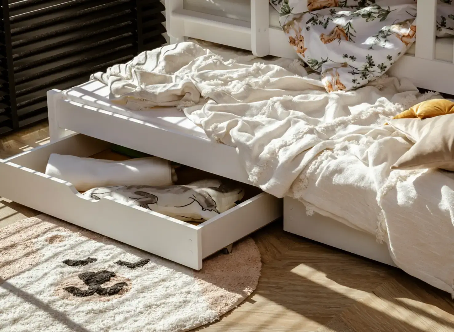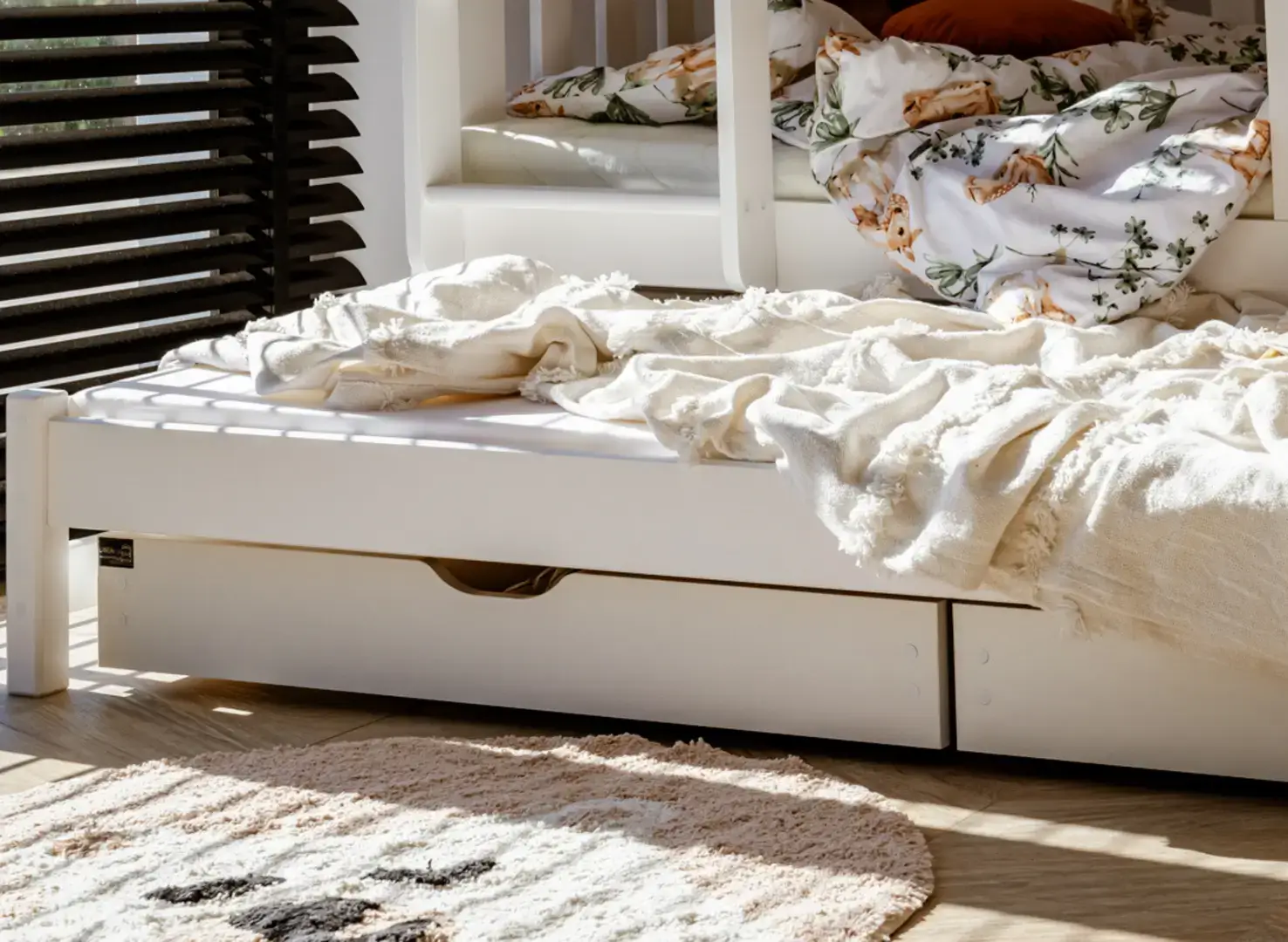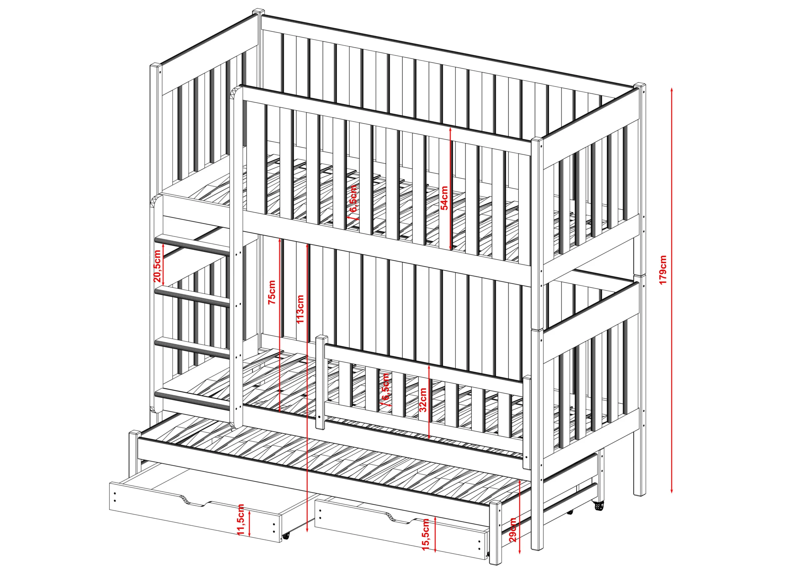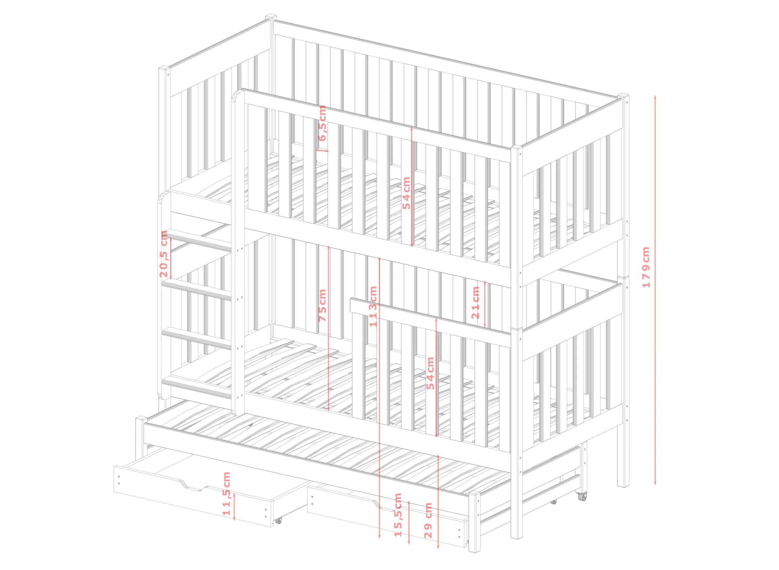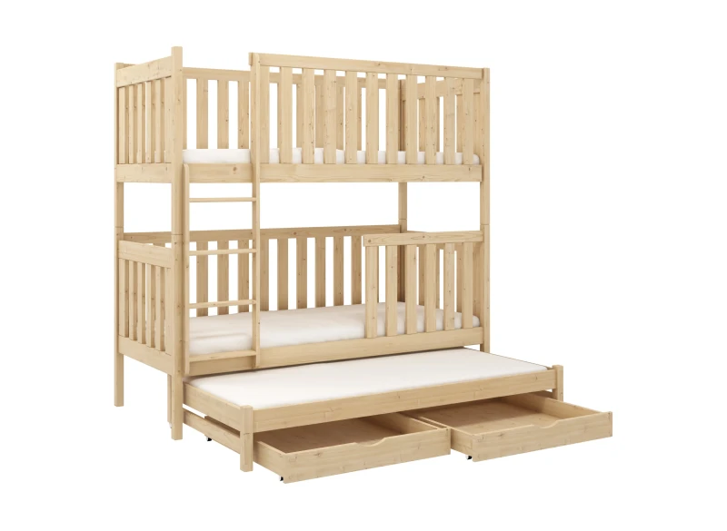 Αναζητάτε λύση για ένα λειτουργικό και όμορφο παιδικό δωμάτιο; Η ξύλινη κουκέτα EMILKA είναι η τέλεια επιλογή! Φτιαγμένο με προσοχή στη λεπτομέρεια και με υλικά υψηλής ποιότητας, το EMILKA εξασφαλίζει έναν ήρεμο και υγιεινό ύπνο. Ο κλασικός σχεδιασμός του ταιριάζει ιδανικά σε κάθε παιδικό δωμάτιο – αγοριών ή κοριτσιών. Η κουκέτα EMILKA είναι κατάλληλη για τρία παιδιά – περιλαμβάνει συρόμενο τρίτο κρεβάτι, καθιστώντας το εξαιρετική επιλογή για αδέλφια ή φιλοξενία φίλων. Η κατασκευή του από φυσικό πεύκο, οι ασφαλείς βαφές και η δυνατότητα αφαίρεσης των προστατευτικών κάγκελων το καθιστούν ασφαλές και πρακτικό για καθημερινή χρήση και παιχνίδι. ✅ 3 θέσεις ύπνου σε έναν μοντέρνο σχεδιασμό ✅ 100% φυσικό ξύλο πεύκου, φιλικό για αλλεργικούς και μαλακό στην αφή ✅ Προαιρετικά αφαιρούμενα προστατευτικά κάγκελα για ευελιξία χρήσης ✅ Συρόμενο τρίτο κρεβάτι – ιδανικό για αδέλφια ή επισκέπτες ✅ Ευρύχωρα συρτάρια για παιχνίδια ή λευκά είδη ✅ Δυνατότητα μετατροπής σε δύο μονά κρεβάτια ✅ Προαιρετική αύξηση κάθετου ύψους (προέκταση) για μεγαλύτερη άνεση και χώρο ✅ Πιστοποιήσεις FSC & REACH, απόλυτα ασφαλές και οικολογικό προϊόν ✅ Εύκολο στη συναρμολόγηση, με επιλογή υποστήριξης από την ομάδα μας