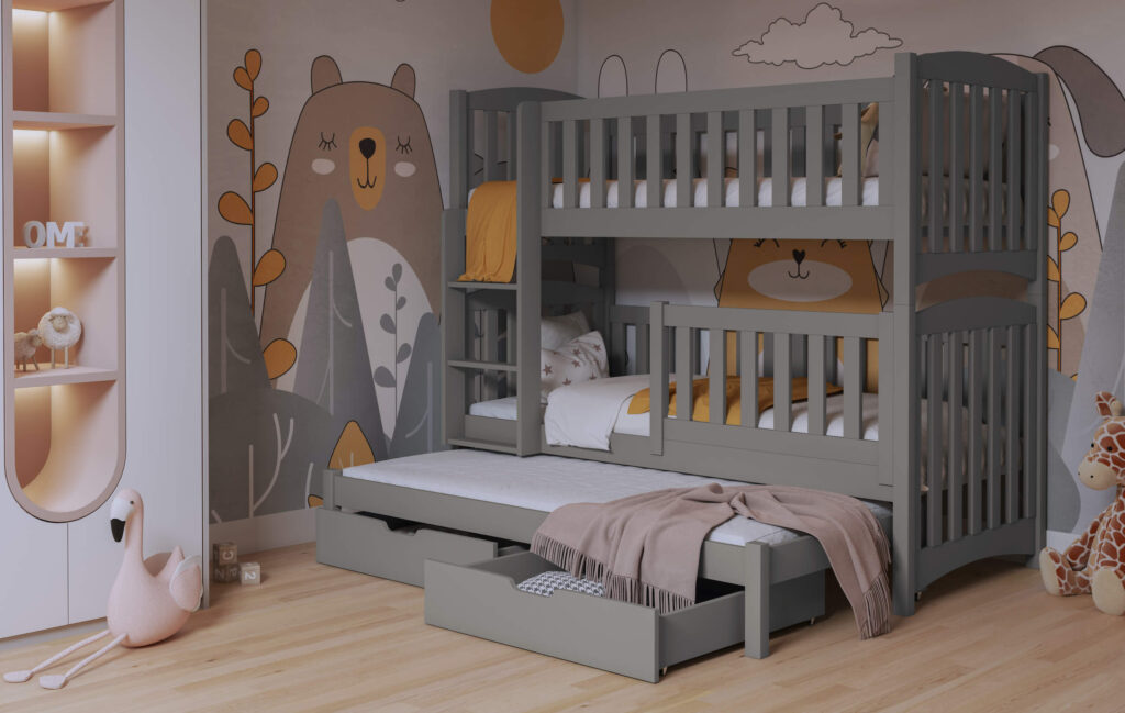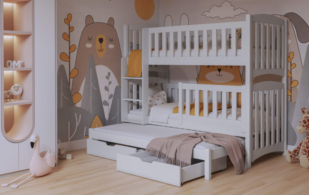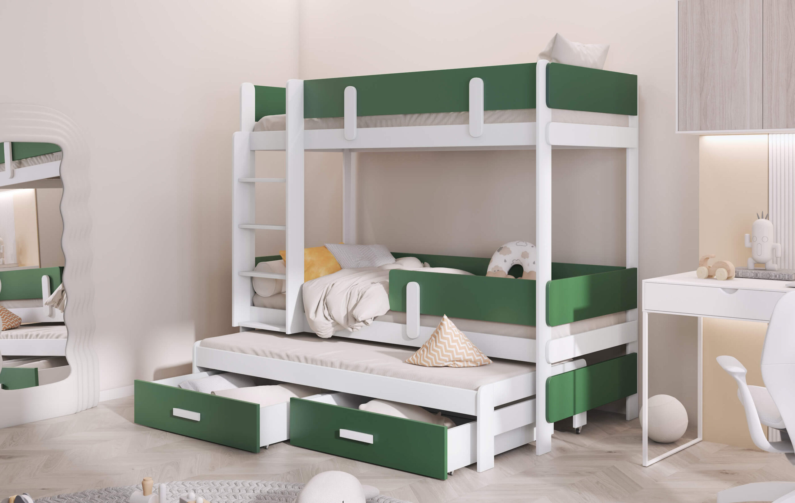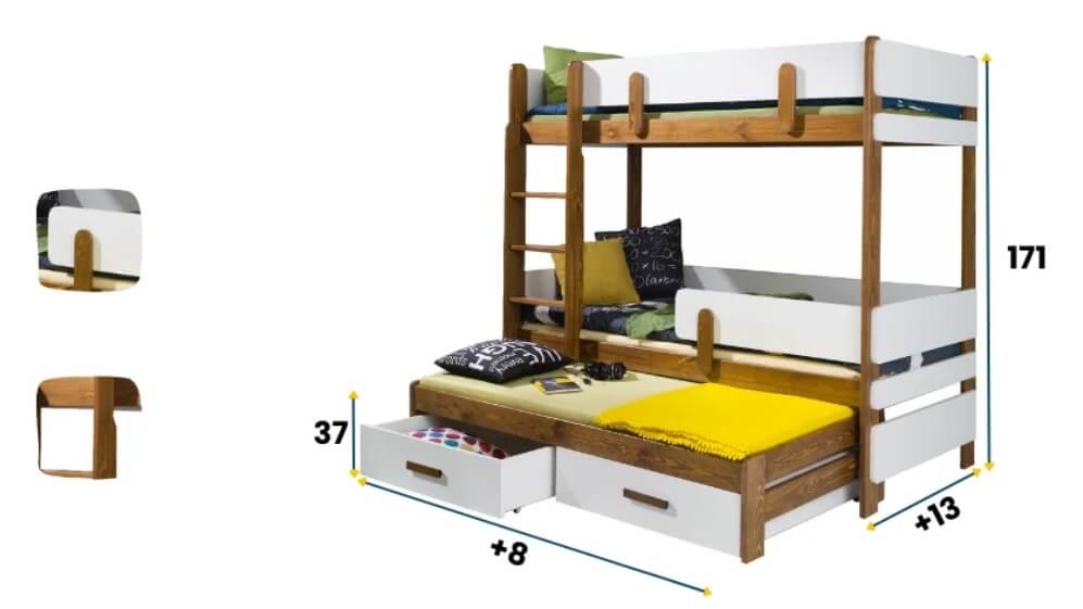 Η ETORRE 3 είναι μια ανθεκτική και στιβαρή κουκέτα που κοιμίζει 3 παιδιά! Κατασκευασμένη εξ ολοκλήρου από μασίφ ξύλο! Είναι περασμένη τρεις φορές με βερνίκι που δεν λεκιάζει! Προστατευτικά κάγκελα περιμετρικά, πράγμα που την καθιστά ασφαλή για χρήση και από πολύ μικρά παιδάκια! Περιλαμβάνει: – Δύο μεγάλα συρτάρια αποθήκευσης με ροδάκια! – Συρόμενο κρεβάτι – Τάβλες – Προστατευτικό κάγκελο στο κάτω κρεβάτι – Αναλυτικές οδηγίες συναρμολόγησης Το προϊόν παραδίδεται αμοντάριστο σε κουτιά. Διαθέσιμη υπηρεσία συναρμολόγησης με επιπλέον κόστος.