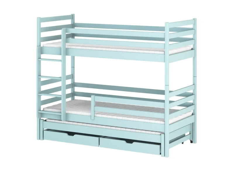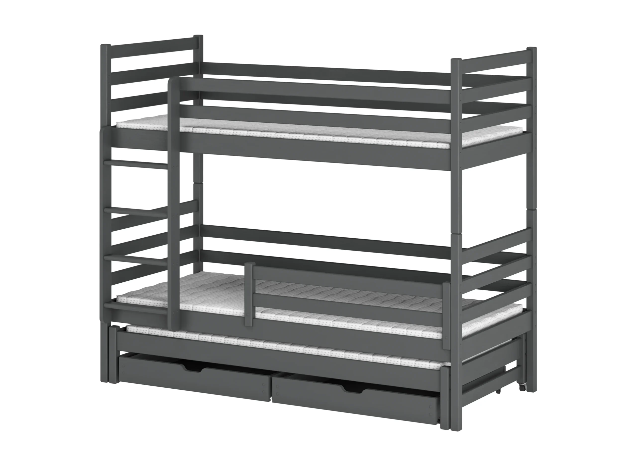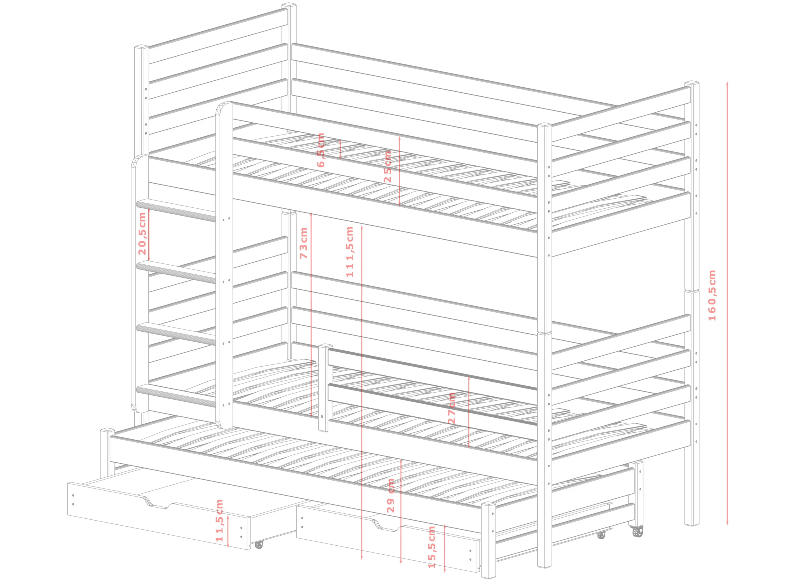 Η κουκέτα LUK είναι κατάλληλη για τρία παιδιά – περιλαμβάνει συρόμενο τρίτο κρεβάτι, καθιστώντας το εξαιρετική επιλογή για αδέλφια ή φιλοξενία φίλων. Η κατασκευή του από φυσικό πεύκο, οι ασφαλείς βαφές και η δυνατότητα αφαίρεσης των προστατευτικών κάγκελων το καθιστούν ασφαλές και πρακτικό για καθημερινή χρήση και παιχνίδι.