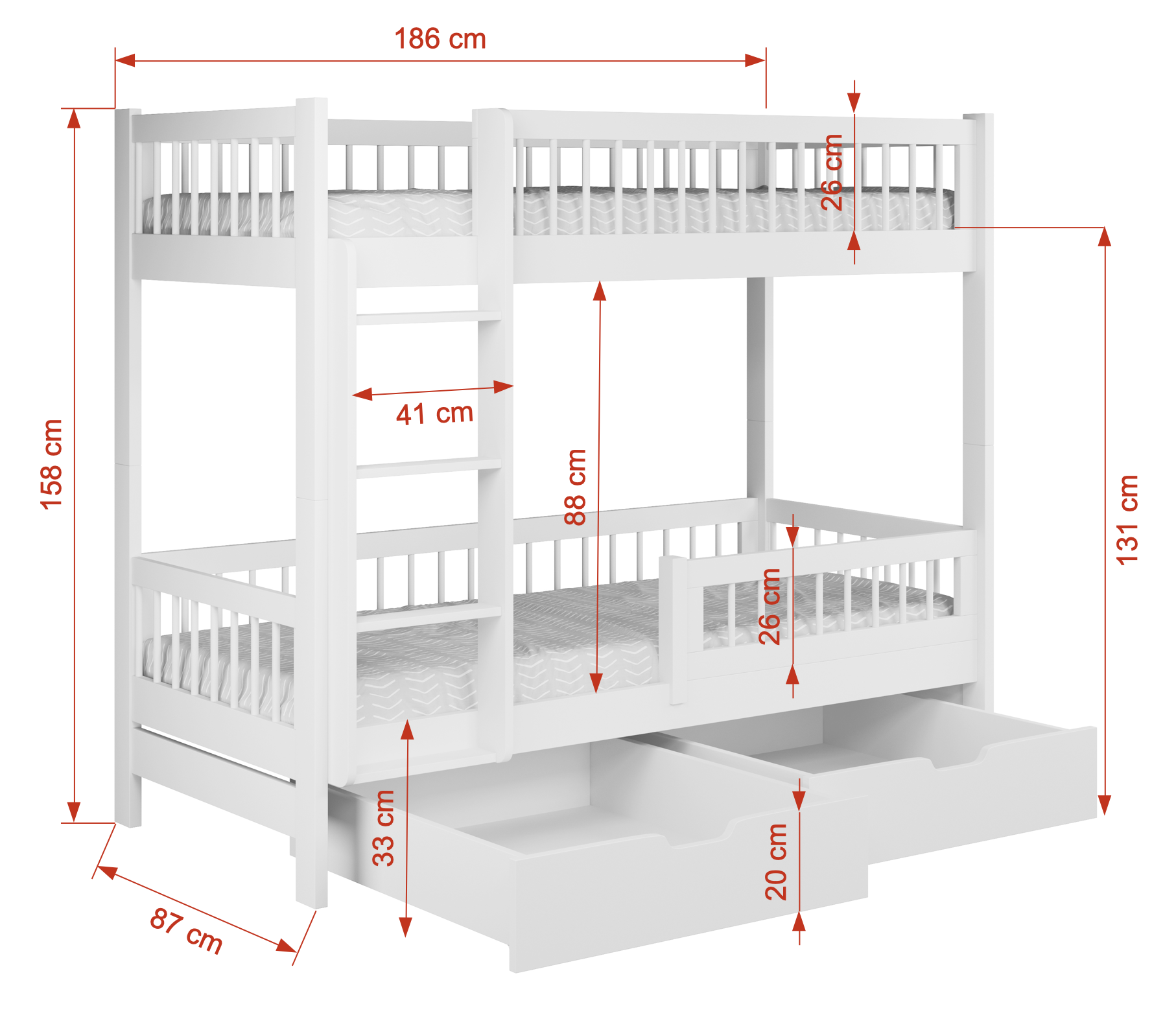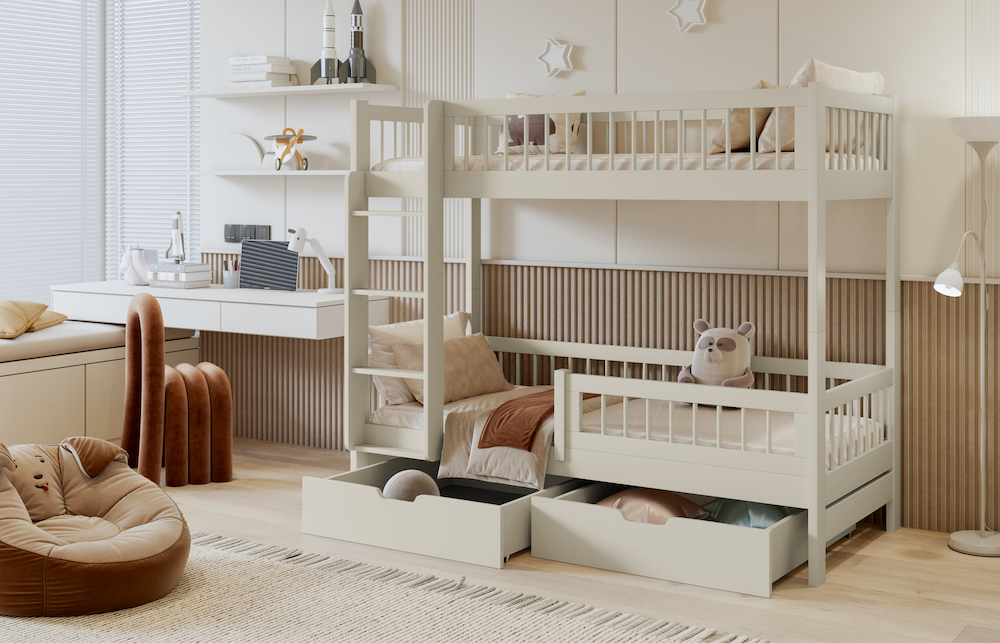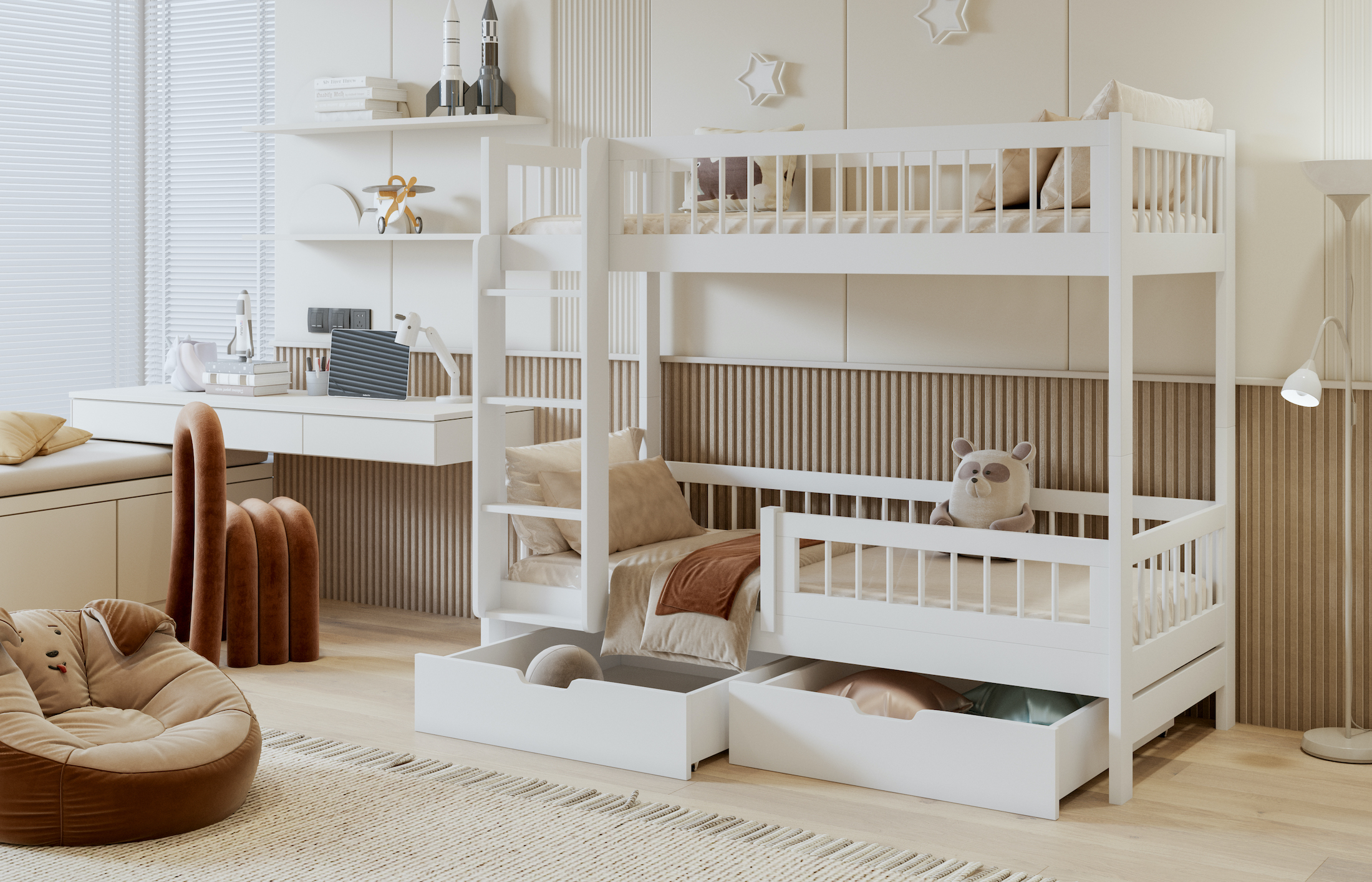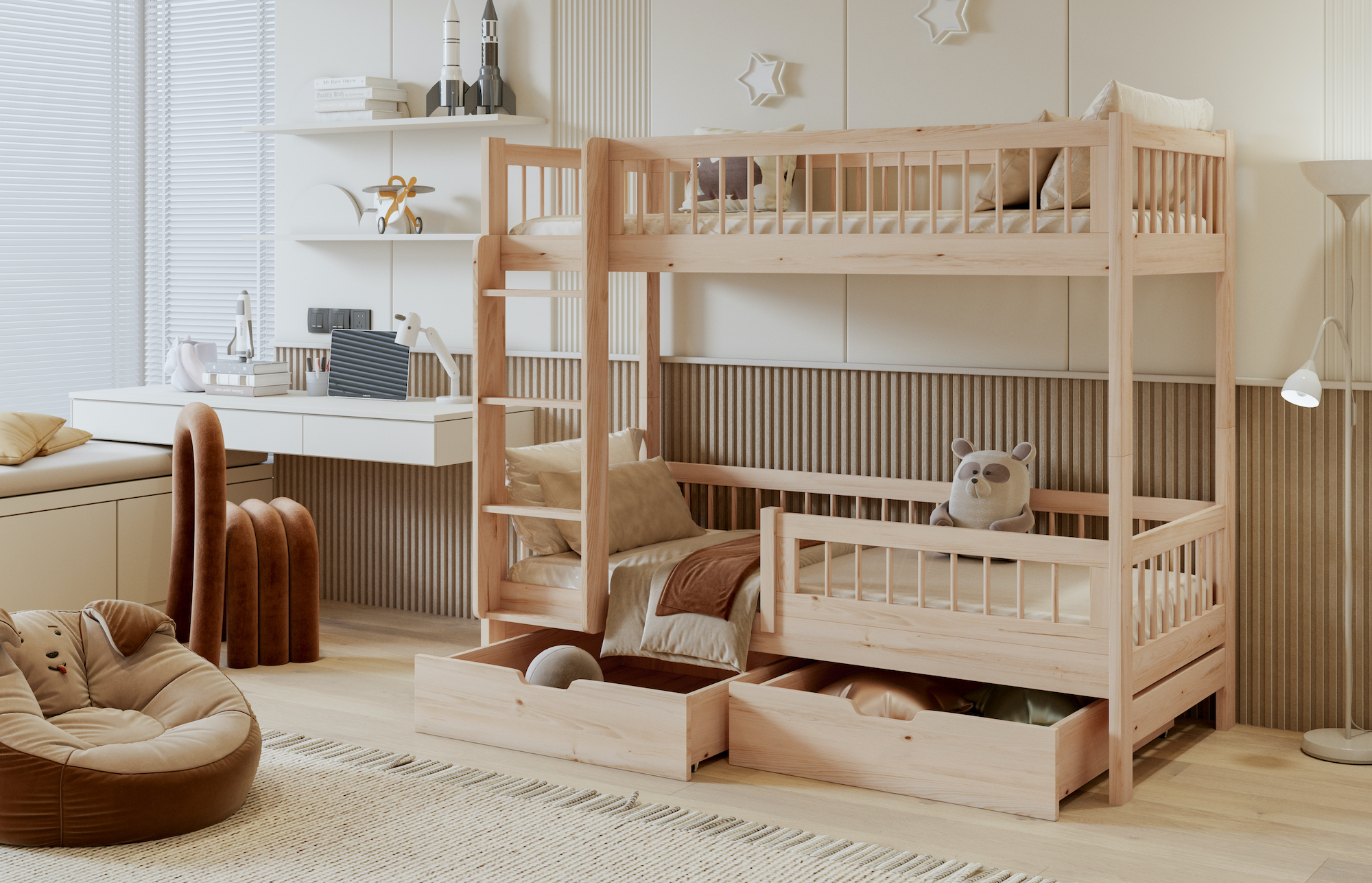 Η κουκέτα Coen είναι η ιδανική επιλογή για κάθε παιδικό ή εφηβικό δωμάτιο. Με διαχρονικό σχεδιασμό και εξαιρετική ποιότητα κατασκευής από μασίφ ξύλο πεύκου, συνδυάζει υψηλή αισθητική με πρακτικότητα. Η επιφάνειά της είναι καλυμμένη με τρία στρώματα οικολογικού βερνικιού, προσφέροντας αντοχή σε γρατζουνιές και καθημερινή χρήση, ενώ αναδεικνύει τη φυσική υφή του ξύλου. Φυσικό υλικό: Κατασκευή από 100% μασίφ ξύλο πεύκου για εξαιρετική αντοχή και φυσική ομορφιά. Διαιρούμενη κατασκευή: Μετατρέπεται εύκολα σε δύο μονά κρεβάτια – ιδανική λύση για τις μελλοντικές ανάγκες του παιδιού σας. Ασφαλής σχεδίαση: Υψηλά προστατευτικά κάγκελα στο επάνω κρεβάτι για απόλυτη ασφάλεια στον ύπνο. Έξυπνη αποθήκευση: Περιλαμβάνει δύο μεγάλα συρτάρια στη βάση για παιχνίδια, ρούχα ή λευκά είδη (Τα στρώματα δεν περιλαμβάνονται – μπορείτε να τα προσθέσετε ξεχωριστά μέσα από τη συλλογή μας.)
