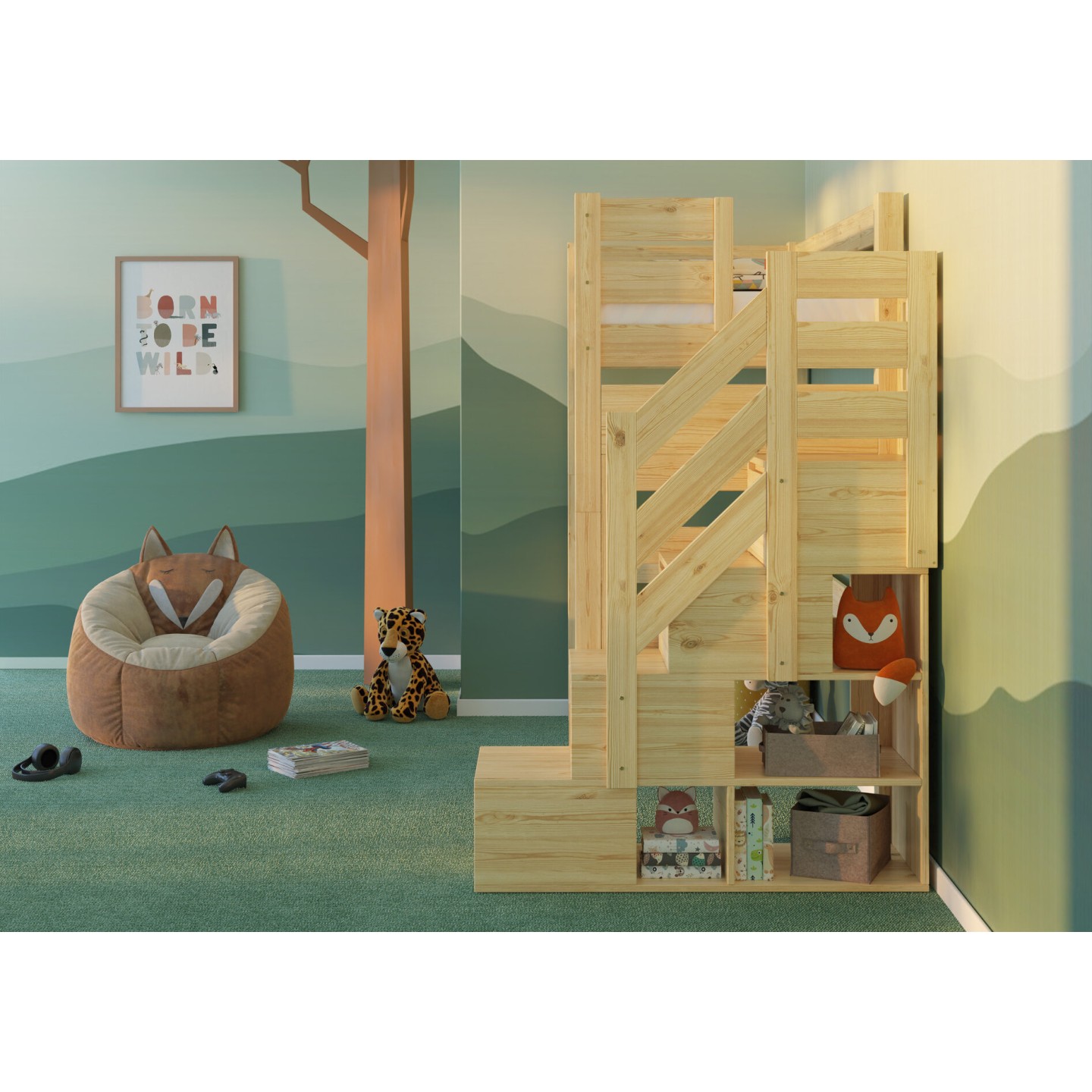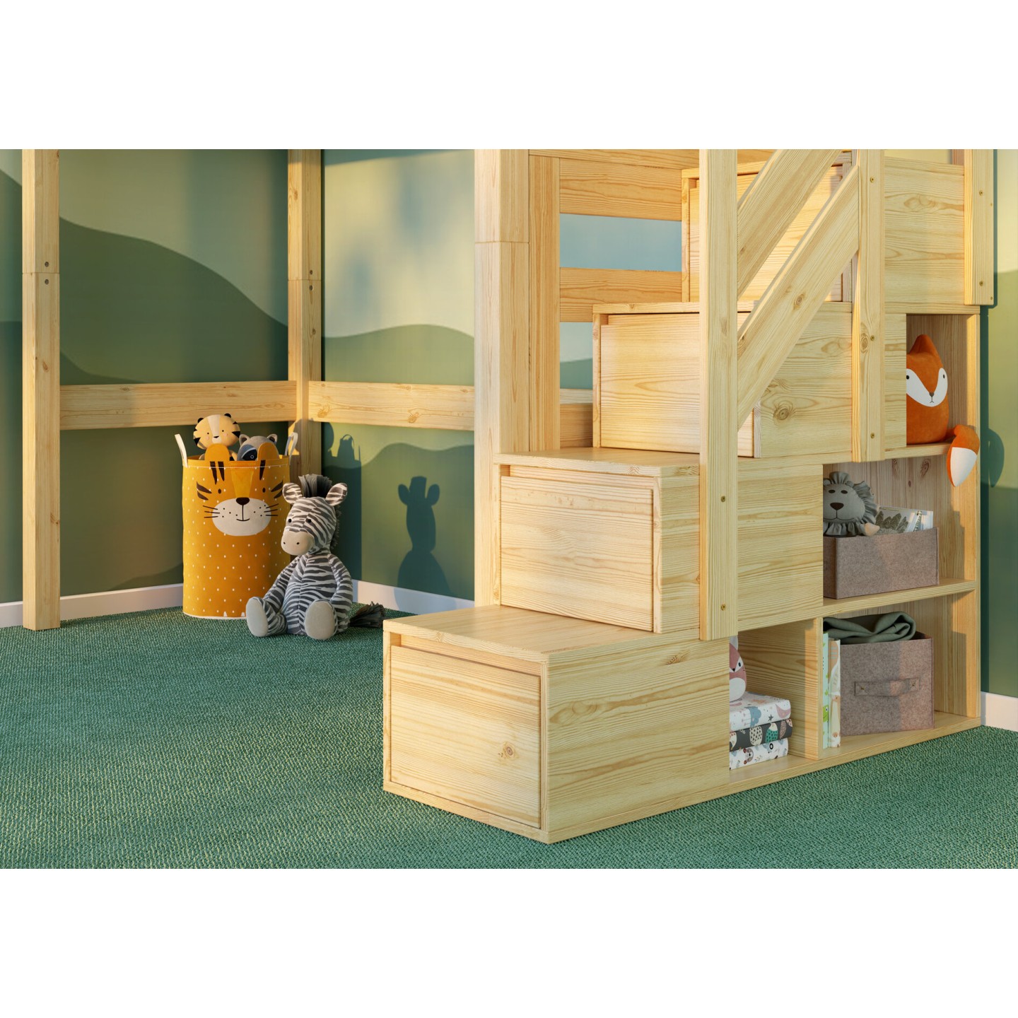 Τα πλατιά σκαλοπάτια λειτουργούν ταυτόχρονα και ως αποθηκευτικά συρτάρια, προσφέροντας πρακτικό χώρο για παιχνίδια, βιβλία ή παιδικά αντικείμενα. Η στιβαρή κατασκευή και τα προστατευτικά κάγκελα εξασφαλίζουν ασφαλή χρήση για παιδιά, ενώ η σκάλα μπορεί να τοποθετηθεί δεξιά ή αριστερά ανάλογα με τη διάταξη του χώρου.