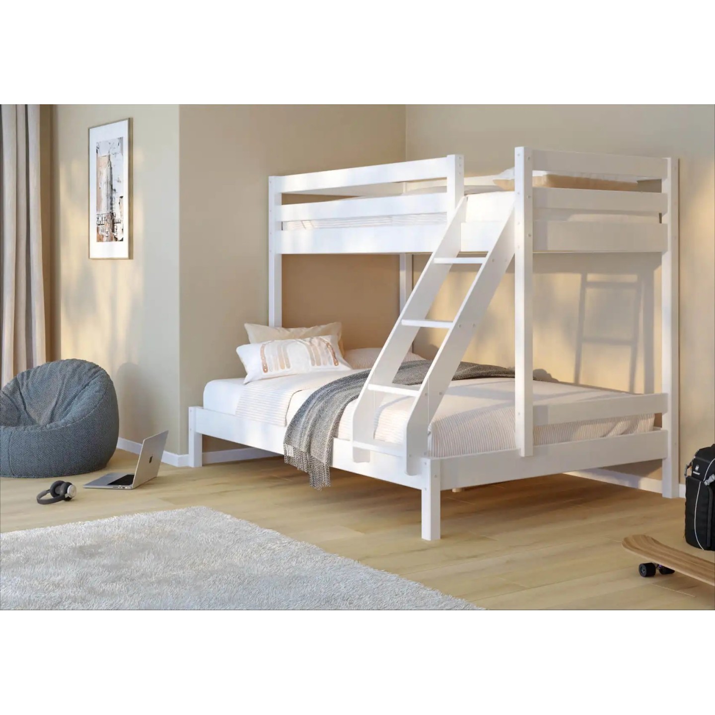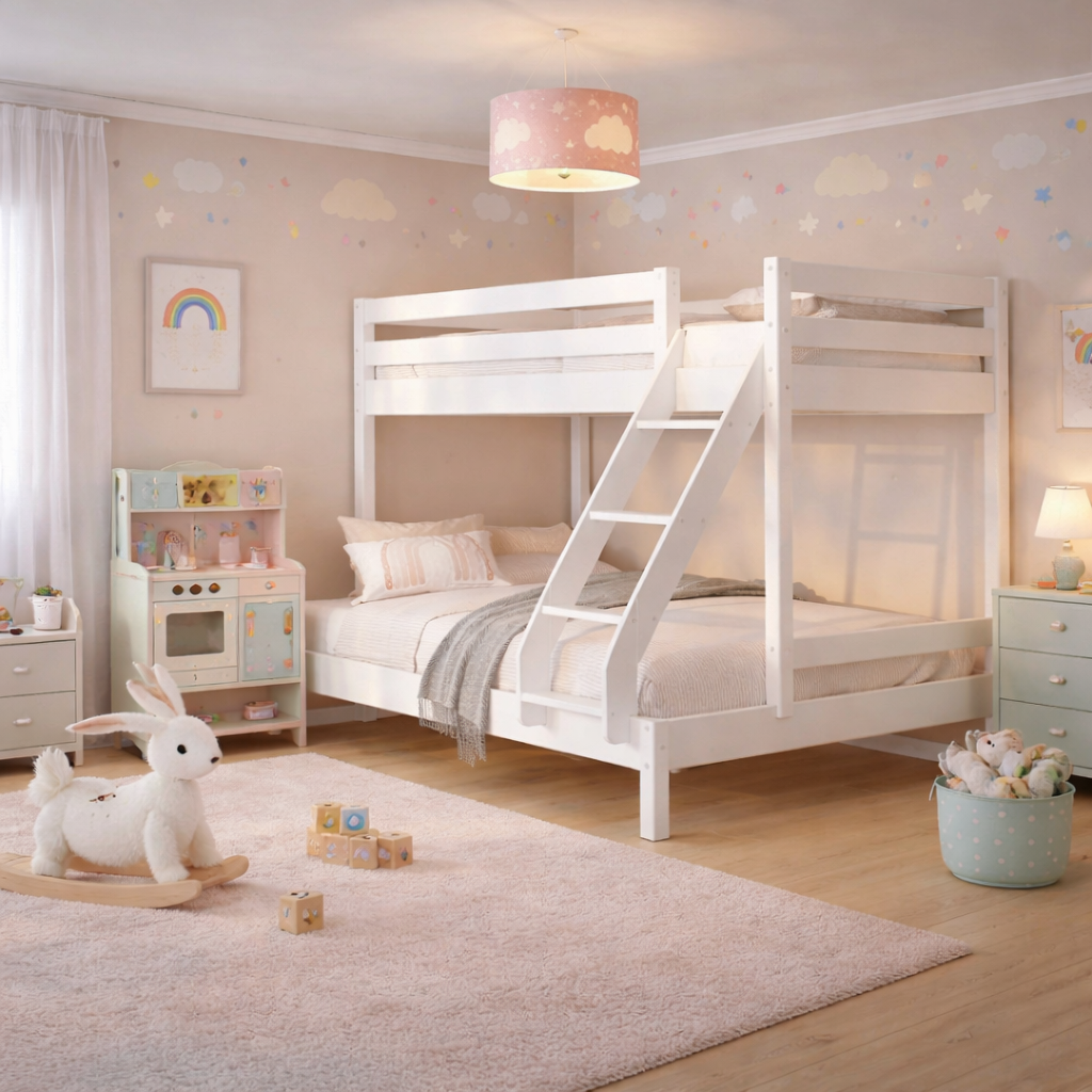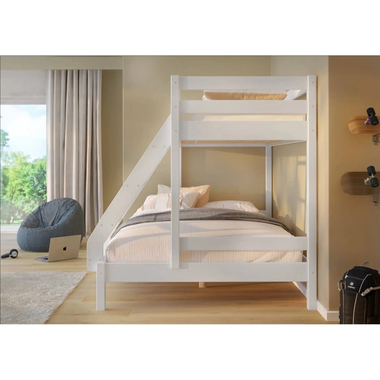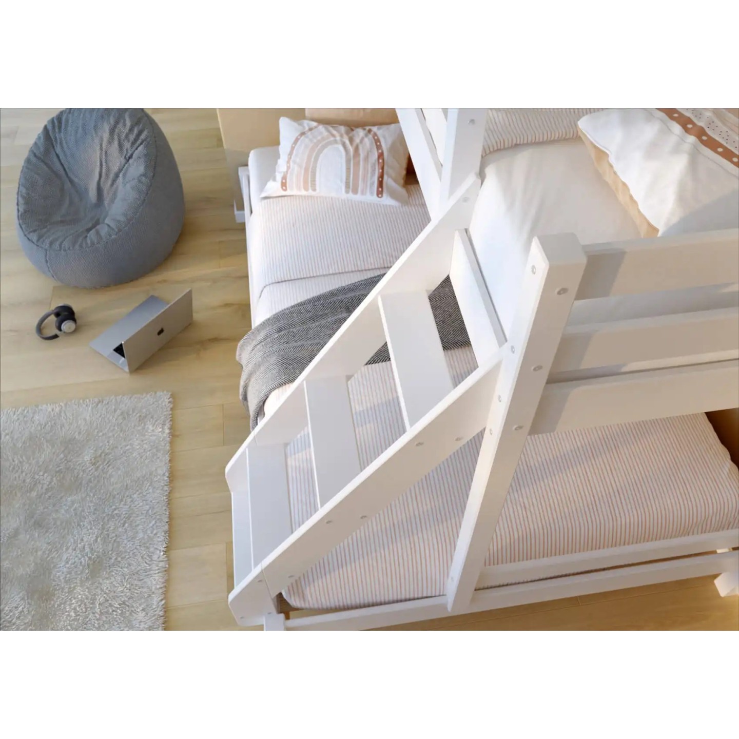 Η παιδική κουκέτα 3 θέσεων αποτελεί την ιδανική λύση για οικογένειες που χρειάζονται περισσότερο χώρο ύπνου χωρίς να θυσιάζουν τον διαθέσιμο χώρο στο παιδικό δωμάτιο. Ο έξυπνος σχεδιασμός της συνδυάζει ένα μονό επάνω κρεβάτι (90×200 εκ.) και ένα φαρδύτερο κάτω κρεβάτι (140×200 εκ.), προσφέροντας άνετο ύπνο για έως και τρία άτομα.