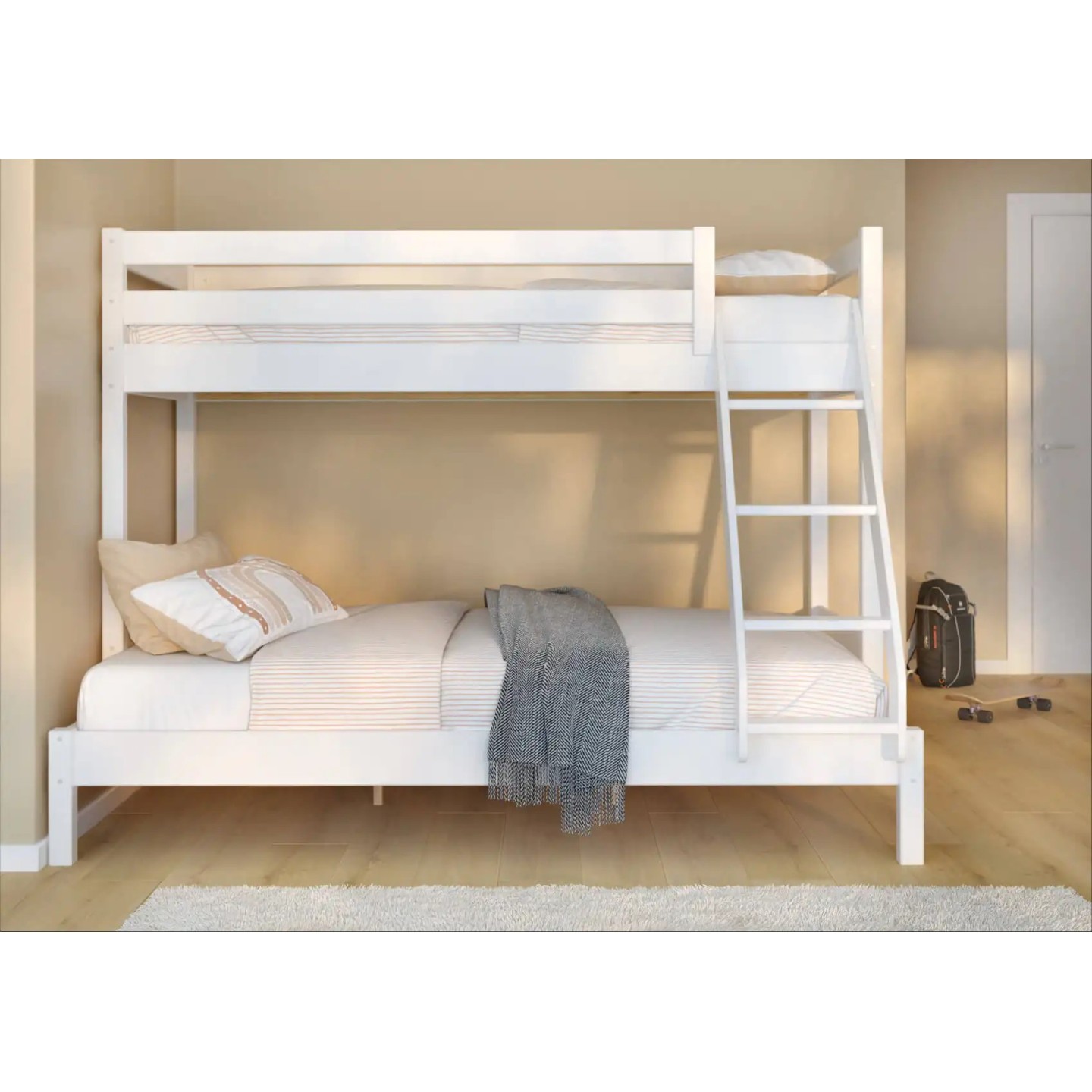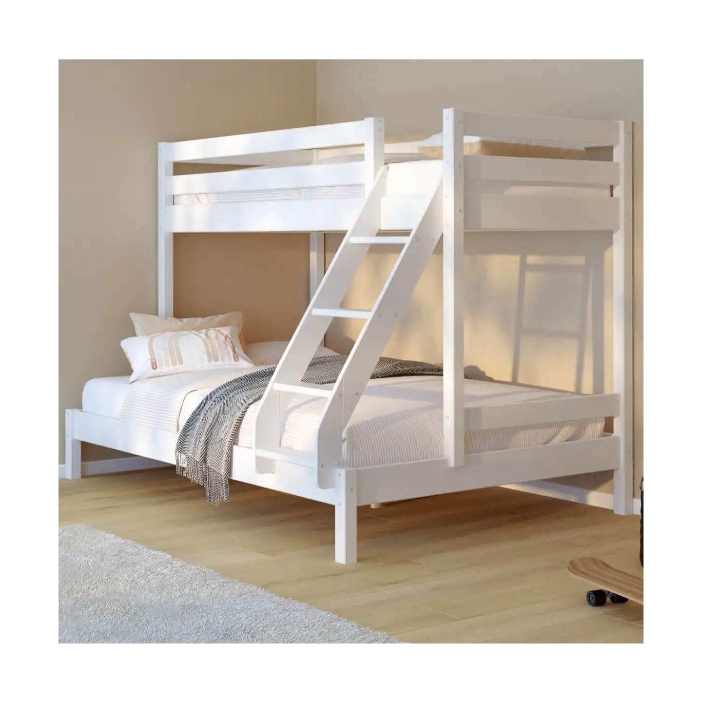 ✅ Χαρακτηριστικά: Διαστάσεις στρωμάτων: 90 × 200 εκ. (επάνω) και 140 × 200 εκ. (κάτω) Υλικό κατασκευής: Μασίφ ξύλο πεύκου Οικολογικά βερνίκια κατάλληλα για παιδικά έπιπλα Σκάλα πρόσβασης με δυνατότητα τοποθέτησης δεξιά ή αριστερά Σταθερή και ανθεκτική κατασκευή Μέγιστο φορτίο: 140 κιλά στο κάτω κρεβάτι / 100 κιλά στο επάνω Προτεινόμενο ύψος στρώματος: έως 18 εκ. Δυνατότητα επιλογής συρταριού αποθήκευσης ή επιπλέον συρόμενου κρεβατιού Κατάλληλη για παιδιά από 3 ετών (επάνω κρεβάτι από 6 ετών)