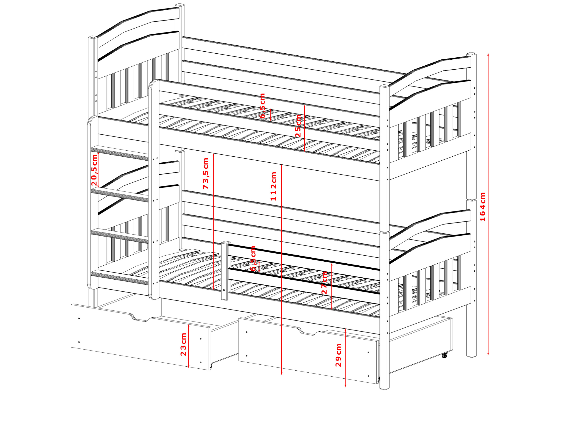 H παιδική κουκέτα GABI είναι η ιδανική επιλογή για κάθε παιδικό δωμάτιο. Με τον παιχνιδιάρικο και ταυτόχρονα λειτουργικό σχεδιασμό του, αποτελεί μια ασφαλή και όμορφη λύση για δύο παιδιά. Κατασκευασμένο εξ ολοκλήρου από μασίφ ξύλο πεύκου, διαθέτει προστατευτικά κάγκελα, κάθετη σκάλα, και ευρύχωρα συρτάρια για αποθήκευση. Η κουκέτα GABI δεν εξοικονομεί μόνο χώρο, αλλά προσφέρει και έναν ήσυχο, υγιεινό ύπνο χάρη στα οικολογικά υλικά του. ✅ 100% φυσικό ξύλο πεύκου – Ανθεκτικό, φιλικό για αλλεργικούς και μαλακό στην αφή. ✅ Ασφαλές για παιδιά – Με πιστοποιημένα προστατευτικά κάγκελα και ασφαλή σκάλα. ✅ Οικολογική επιλογή – Βαμμένο με χρώματα νερού, χωρίς τοξικές ουσίες. ✅ Με δυνατότητα αποθήκευσης – Διαθέτει 2 ευρύχωρα συρτάρια για παιχνίδια ή λευκά είδη. ✅ Εργονομία & άνεση – Μελετημένος σχεδιασμός που αφήνει επαρκή κάθετο χώρο (προαιρετικά) για άνεση στο κάτω κρεβάτι. ✅ Ευελιξία στη διαμόρφωση – Δυνατότητα επιλογής αριστερής ή δεξιάς διάταξης της σκάλας, καθώς και αποσυναρμολόγησης σε δύο ξεχωριστά μονά κρεβάτια. ✅ Σύμφωνο με ευρωπαϊκές προδιαγραφές ασφάλειας (EN 747-1) και περιβαλλοντικά πρότυπα (FSC, REACH).