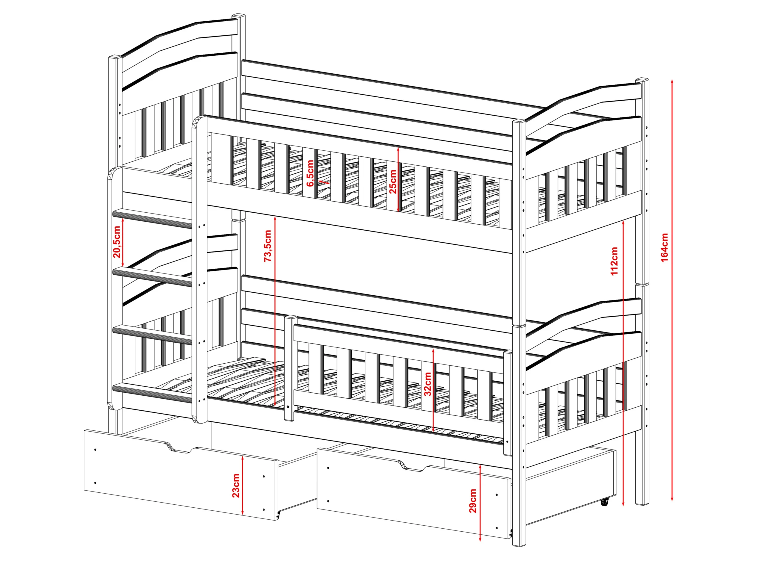 H παιδική κουκέτα IGNAS είναι η ιδανική επιλογή για κάθε παιδικό δωμάτιο. Με τον παιχνιδιάρικο και ταυτόχρονα λειτουργικό σχεδιασμό του, αποτελεί μια ασφαλή και όμορφη λύση για δύο παιδιά. Κατασκευασμένο εξ ολοκλήρου από μασίφ ξύλο πεύκου, διαθέτει προστατευτικά κάγκελα, κάθετη σκάλα, και ευρύχωρα συρτάρια για αποθήκευση. Η κουκέτα IGNAS δεν εξοικονομεί μόνο χώρο, αλλά προσφέρει και έναν ήσυχο, υγιεινό ύπνο χάρη στα οικολογικά υλικά του. ✅ 100% φυσικό ξύλο πεύκου – Ανθεκτικό, φιλικό για αλλεργικούς και μαλακό στην αφή. ✅ Ασφαλές για παιδιά – Με πιστοποιημένα προστατευτικά κάγκελα και ασφαλή σκάλα. ✅ Οικολογική επιλογή – Βαμμένο με χρώματα νερού, χωρίς τοξικές ουσίες. ✅ Με δυνατότητα αποθήκευσης – Διαθέτει 2 ευρύχωρα συρτάρια για παιχνίδια ή λευκά είδη. ✅ Εργονομία & άνεση – Μελετημένος σχεδιασμός που αφήνει επαρκή κάθετο χώρο (προαιρετικά) για άνεση στο κάτω κρεβάτι. ✅ Ευελιξία στη διαμόρφωση – Δυνατότητα επιλογής αριστερής ή δεξιάς διάταξης της σκάλας, καθώς και αποσυναρμολόγησης σε δύο ξεχωριστά μονά κρεβάτια. ✅ Σύμφωνο με ευρωπαϊκές προδιαγραφές ασφάλειας (EN 747-1) και περιβαλλοντικά πρότυπα (FSC, REACH).
