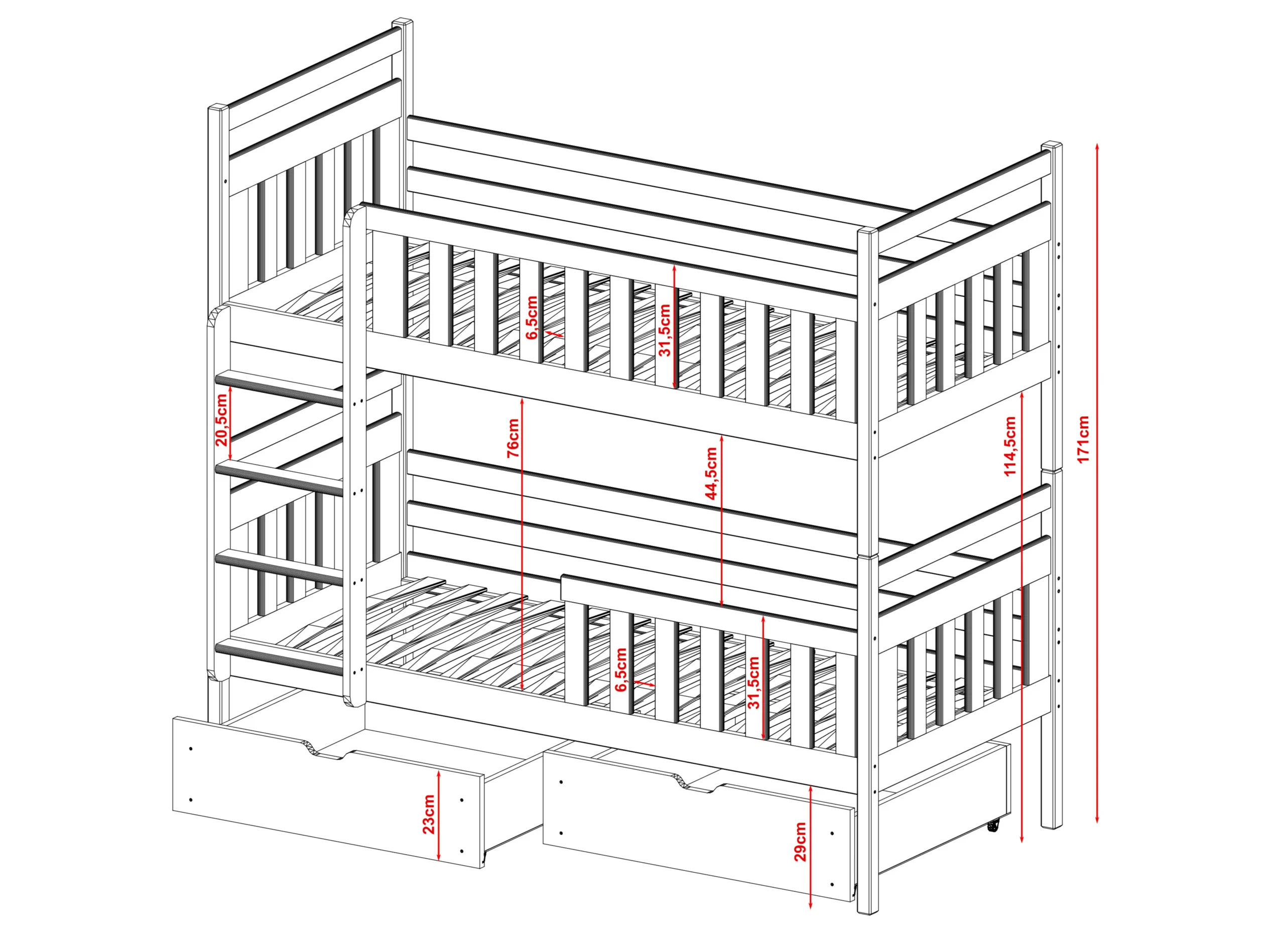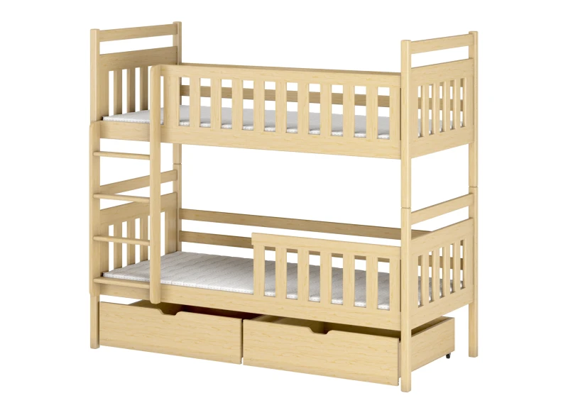 H παιδική κουκέτα MONIKA είναι η ιδανική επιλογή για κάθε παιδικό δωμάτιο. Με τον παιχνιδιάρικο και ταυτόχρονα λειτουργικό σχεδιασμό του, αποτελεί μια ασφαλή και όμορφη λύση για δύο παιδιά. Κατασκευασμένο εξ ολοκλήρου από μασίφ ξύλο πεύκου, διαθέτει προστατευτικά κάγκελα, κάθετη σκάλα, και ευρύχωρα συρτάρια για αποθήκευση. Η κουκέτα MONIKA δεν εξοικονομεί μόνο χώρο, αλλά προσφέρει και έναν ήσυχο, υγιεινό ύπνο χάρη στα οικολογικά υλικά του. ✅ 100% φυσικό ξύλο πεύκου – Ανθεκτικό, φιλικό για αλλεργικούς και μαλακό στην αφή. ✅ Ασφαλές για παιδιά – Με πιστοποιημένα προστατευτικά κάγκελα και ασφαλή σκάλα. ✅ Οικολογική επιλογή – Βαμμένο με χρώματα νερού, χωρίς τοξικές ουσίες. ✅ Με δυνατότητα αποθήκευσης – Διαθέτει 2 ευρύχωρα συρτάρια για παιχνίδια ή λευκά είδη. ✅ Εργονομία & άνεση – Μελετημένος σχεδιασμός που αφήνει επαρκή κάθετο χώρο (προαιρετικά) για άνεση στο κάτω κρεβάτι. ✅ Ευελιξία στη διαμόρφωση – Δυνατότητα επιλογής αριστερής ή δεξιάς διάταξης της σκάλας, καθώς και αποσυναρμολόγησης σε δύο ξεχωριστά μονά κρεβάτια. ✅ Σύμφωνο με ευρωπαϊκές προδιαγραφές ασφάλειας (EN 747-1) και περιβαλλοντικά πρότυπα (FSC, REACH).