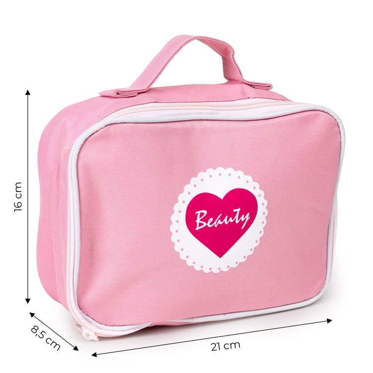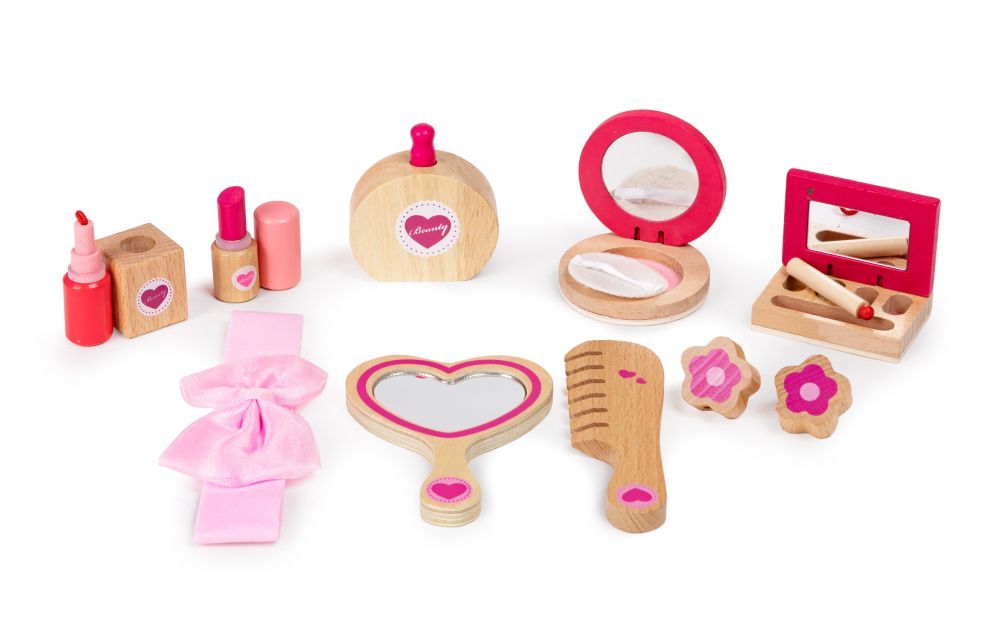 Ένα σετ μακιγιάζ σε μοτίβο καρδιάς για παιδιά άνω των 3 ετών. Περιέχει 10 αξεσουάρ από ξύλο, σχεδιασμένα με γνώμονα την ασφάλεια των παιδιών, στερούνται αιχμηρών και επικίνδυνων στοιχείων. Η τσάντα καλλυντικών περιέχει: κραγιόν βερνίκι νυχιών άρωμα θήκη πούδρας με σφουγγάρι σκιές κεφαλόδεσμος με φιόγκο καθρέφτης χτένα 2 λάστιχα μαλλιών
