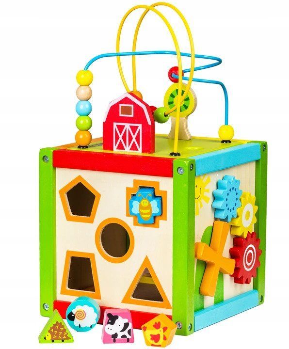 Ο εκπαιδευτικός κύβος είναι κατασκευασμένος από ξύλο, κάθε πλευρά του παρέχει στο παιδί ένα διαφορετικό είδος διασκέδασης. Στο πάνω μέρος του παιχνιδιού υπάρχει ένας λαβύρινθος  με χάντρες, ο οποίος είναι πλήρως αφαιρούμενος. Στα πλαϊνά του κύβου υπάρχουν: γρανάζια, διαλογέας με ξύλινα μπλοκ, καθρέφτης και λαβύρινθος με πολύχρωμα σχήματα. Το προϊόν στερείται αιχμηρών άκρων, βαμμένο με ασφαλή βαφή.