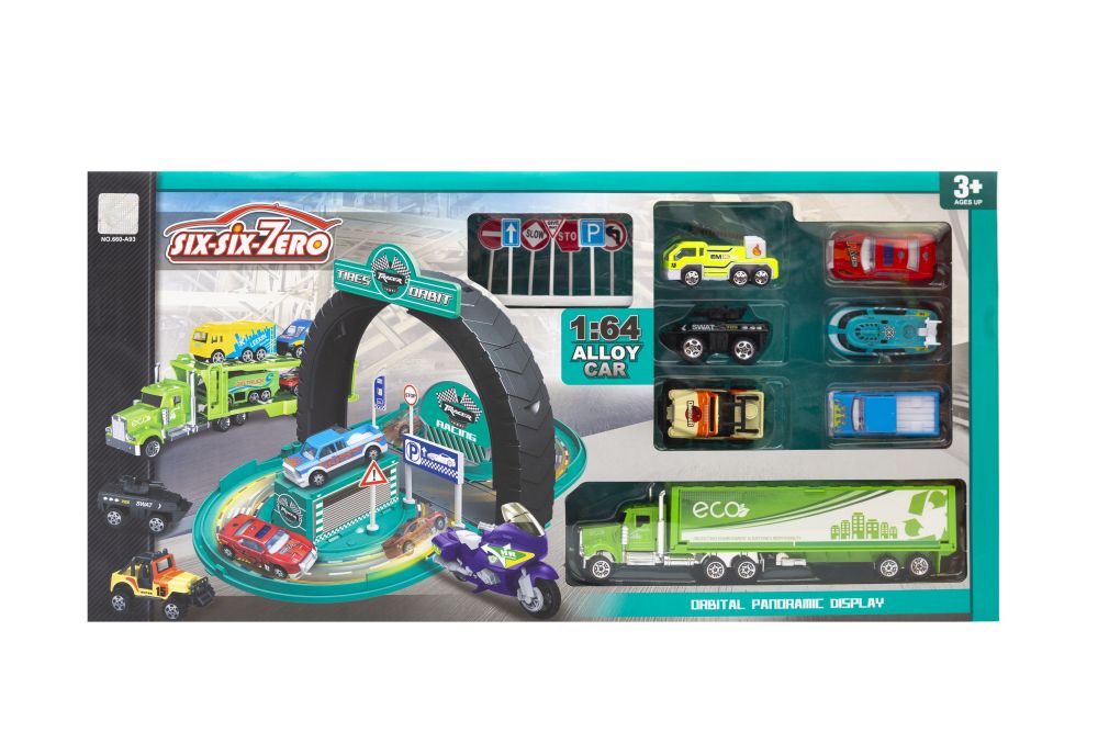Πίστα αγώνων με σετ οχημάτων, τσουλήθρα και πρόσθετα αξεσουάρ. Το κομμάτι έχει 3 μονάδες αναπαραγωγής: ένα διπλωμένο κομμάτι με χώρο για την αποθήκευση ενός οχήματος. μια ανοιχτή πίστα με διπλωμένο τόξο – ένα ελαστικό και μια ξεδιπλωμένη πίστα και καμάρα, χάρη στην οποία δημιουργείται ένα μέρος όπου τα αυτοκίνητα μπορούν να γλιστρήσουν προς τα κάτω. Η τσουλήθρα διαθέτει μοχλό που σας επιτρέπει να χαμηλώσετε το αυτοκίνητο. Η πίστα είναι εξοπλισμένη με ένα σετ οδικών πινακίδων και αυτοκόλλητων για αυτο-τοποθέτηση. Το σετ περιλαμβάνει ένα ρυμουλκούμενο στο οποίο μπορούμε να μεταφέρουμε τα προσαρτημένα μικρότερα οχήματα (και είναι έως και 6 από αυτά!). Το ρυμουλκούμενο είναι ρυθμιζόμενο, ώστε να μπορείτε να αλλάξετε τη διάταξή του και τον αριθμό των διαθέσιμων θέσεων για μεταφορά. Χάρη σε όλα τα παραπάνω χαρακτηριστικά, το σετ θα προσφέρει στον παραλήπτη πολλές ώρες υπέροχης και δημιουργικής διασκέδασης! Το προϊόν είναι συσκευασμένο σε κουτί από χαρτόνι, το οποίο είναι ιδανικό για δώρο. Το σετ περιέχει: 6 οχήματα, ρυμουλκούμενο φορτηγό με δυνατότητα αναδίπλωσης και ξεδίπλωσης επιπέδων, μπορείτε να τοποθετήσετε μικρότερα οχήματα από το σετ αστυνομικής πίστας. οδικές πινακίδες και αυτοκόλλητα