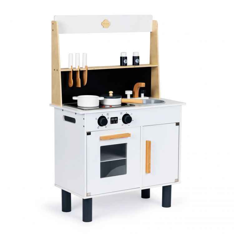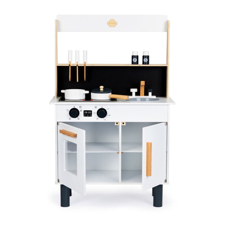Η παιδική κουζίνα είναι κατασκευασμένη από μασίφ ξύλο, πράγμα που εξασφαλίζει τη σταθερότητα και την αντοχή της. Η κουζίνα αποτελείται από έναν φούρνο που ανοίγει, ένα μεγάλο ντουλάπι και 2 μάτια που λειτουργούν με μπαταρία, ανάβουν και κάνουν ήχο μαγειρέματος. Η κουζίνα διαθέτει επίσης βρύση με νεροχύτη και ράφια.