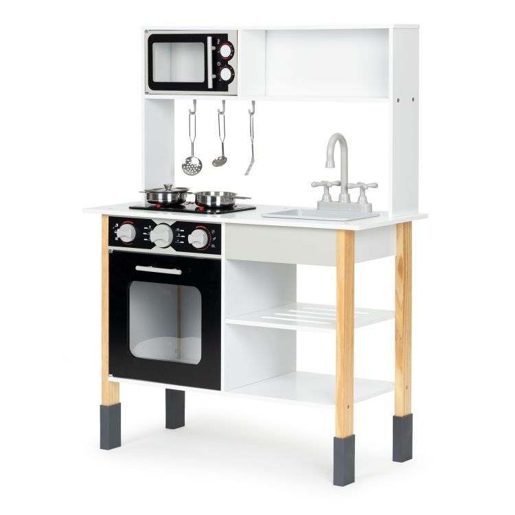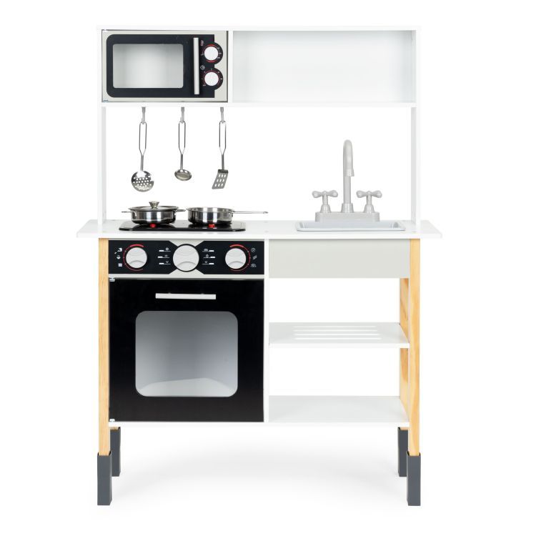 Μια ασφαλής και σταθερή κατασκευή εξασφαλίζει ασφάλεια κατά το παιχνίδι ενώ τα πέντε μεταλλικά αξεσουάρ (κατσαρόλα, τηγάνι με καπάκι, σπάτουλα, σουρωτήρι και κουτάλι ζυμαρικών), δίνουν τη δυνατότητα στα παιδιά να ετοιμάσουν μια ποικιλία από πιάτα.