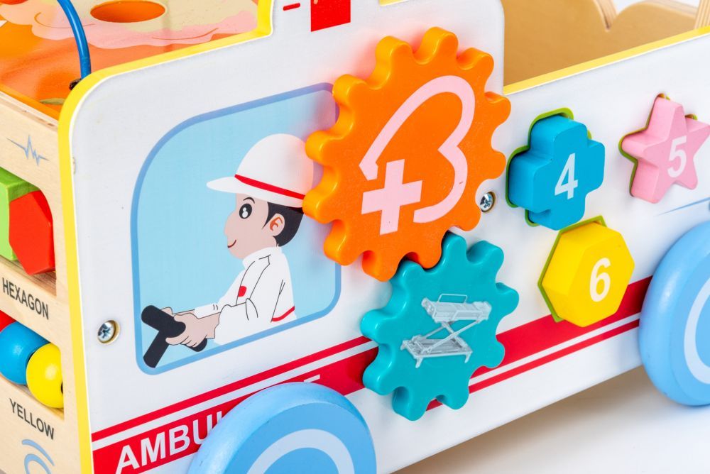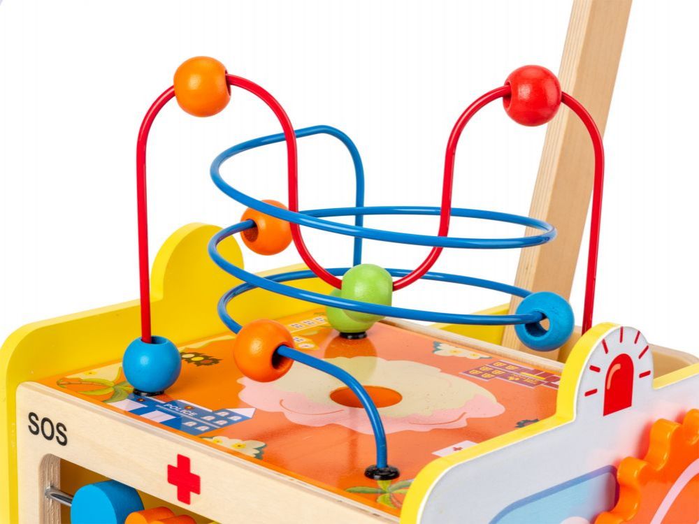 Tο καρότσι -στράτα έχει ένα μοτίβο ασθενοφόρου. Η ξύλινη λαβή είναι σε ύψος 40 εκ., που επιτρέπει την εκμάθηση του περπατήματος. Το καρότσι διαθέτει αντιολισθητικούς τροχούς που δεν γρατσουνίζουν την επιφάνεια και παρέχουν σταθερότητα κατά τη διάρκεια του παιχνιδιού. Το παιχνίδι εκτός από το να ωθήσει το παιδί  να περπατήσει, χρησιμεύει και ως εκπαιδευτικό παιχνίδι. Στους τοίχους του υπάρχουν: διαλογέας με 6 μπλοκ, άβακας, λαβύρινθος και κινητά γρανάζια.