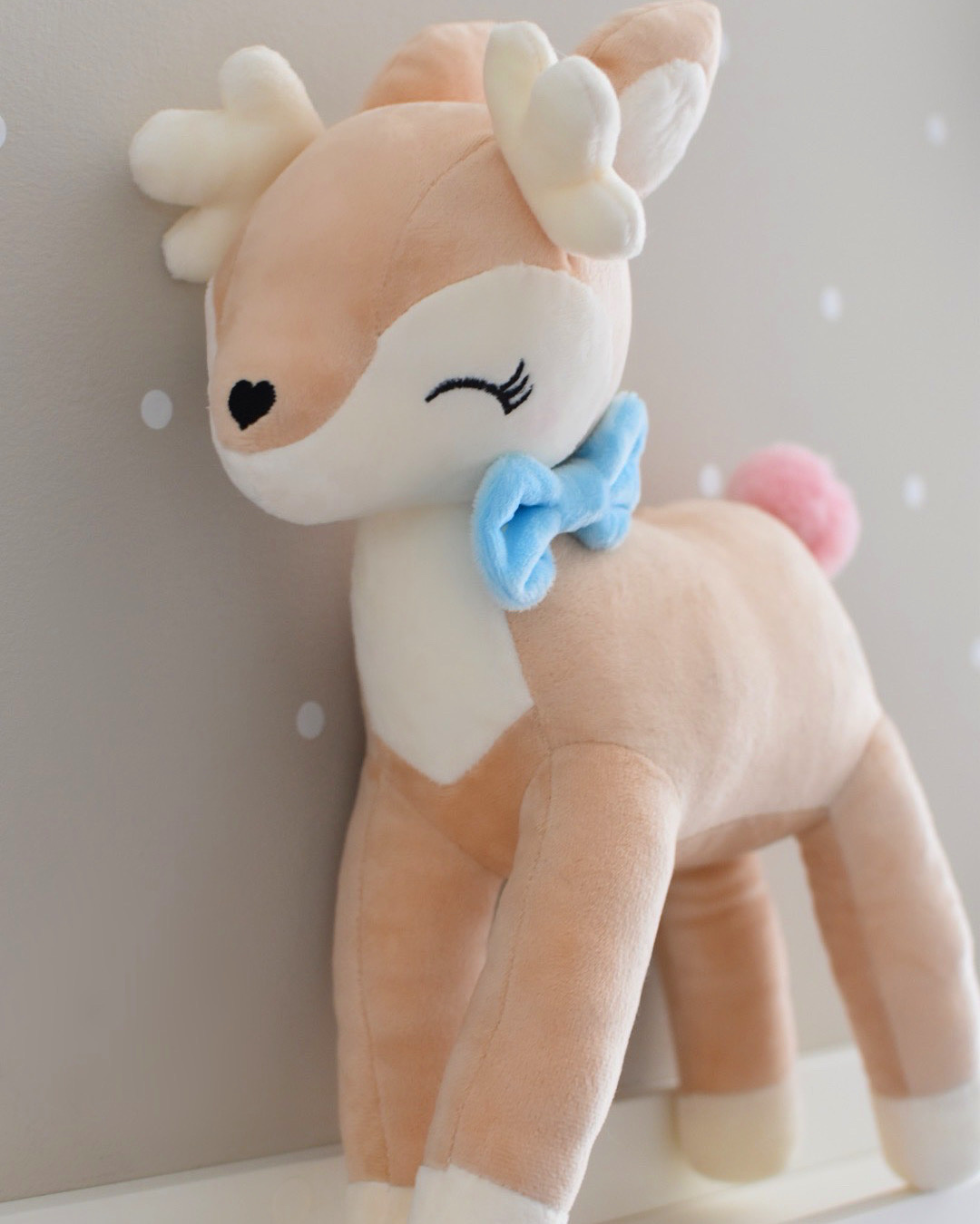 Το βελούδινο ελάφι με μπλε φιόγκο  σε παστέλ χρώματα είναι ένα γλυκό παιχνίδι αγκαλιάς για ένα αγοράκι ή κοριτσάκι.