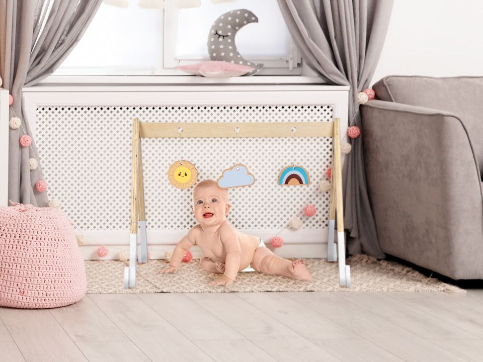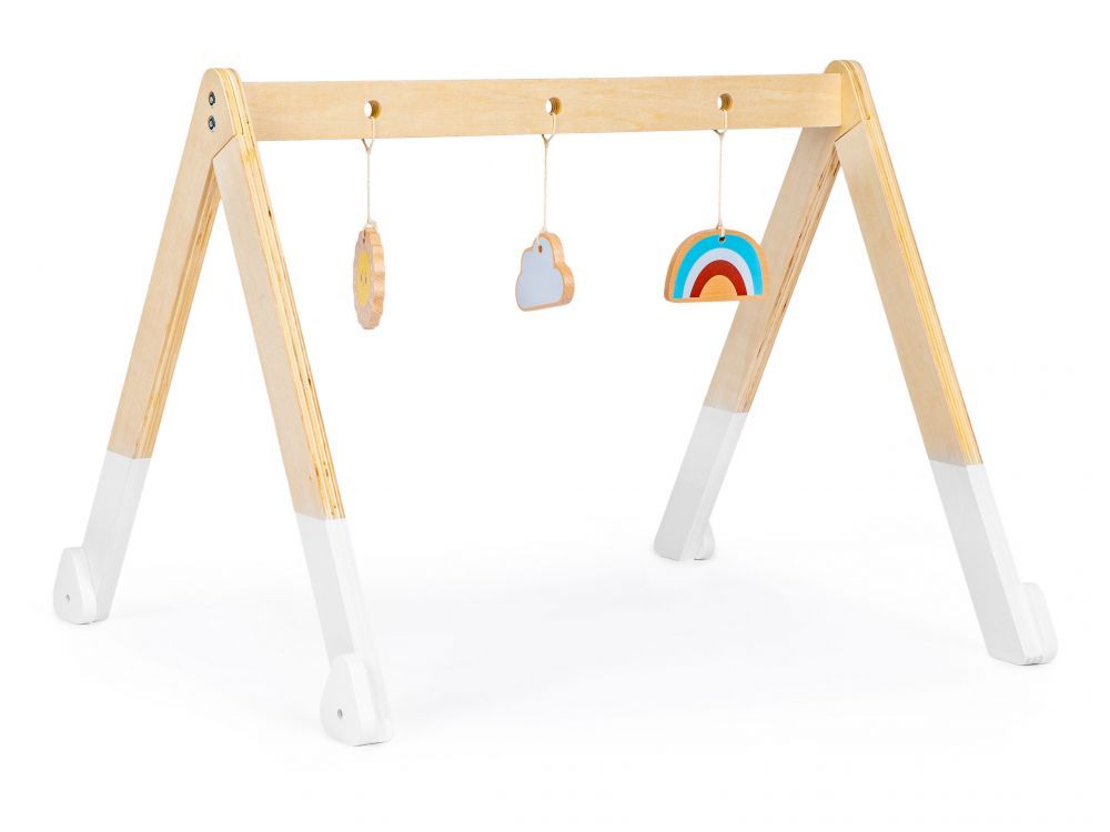 Το ξύλινο βρεφικό γυμναστήριο έχει 3 πολύχρωμα παιχνίδια που είναι κρεμασμένα στη ράβδο του. Κάθε παιχνίδι έχει διαφορετικό σχήμα και χρώμα, έτσι ώστε το μωρό σας να διεγείρεται. Το παιχνίδι δεν έχει αιχμηρές, επικίνδυνες άκρες και καλύπτεται με χρώματα ασφαλή για παιδιά.
