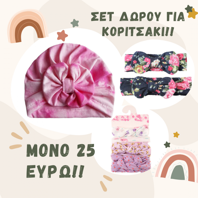 Υπέροχες κορδέλες και τουρμπάνια σε μοναδικά χρώματα και σχέδια που θα ομορφύνουν ακόμα περισσότερο τα βρεφικά και παιδικά κεφαλάκια! Τα πιο ιδιαίτερα τουρμπάνια για απαιτητικές μανούλες και μωρά με στυλ είναι εδώ! Τουρμπάνια: 80% Βαμβάκι – 20% Πολυεστέρας Σίγουρα με ένα τέτοιο τουρμπάνι θα ξεχωρίζετε σε κάθε σας βόλτα! Κατάλληλα από 6 μηνών μέχρι 2 ετών ανάλογα και με την ανάπτυξη του μωρού σας! Ένα σετ μαμά κόρη δεν θα μπορούσε να λείπει από τη συλλογή μας! Οι κορδέλες μας έχουν όλες το αγαπημένο μας μοτίβο δηλαδή το floral! Έχουν φιόγκο στο κέντρο και είναι κατασκευασμένες με μεγάλη αγάπη από εμάς για εσάς και τα μωράκια σας! Ετοιμαστείτε για τις πιο όμορφες φωτογραφίες με matchy matchy κορδέλες μαμά με κόρη! 80% Βαμβάκι – 20% Πολυεστέρας Τέλεια ιδέα για δώρο! Κατάλληλες από 6 μηνών! Κορδέλες με φιόγκους σε διάφορα σχέδια και χρώματα για να διαλέξετε αυτή που σας ταιριάζει περισσότερο! Κατάλληλες από 6 μηνών μέχρι 2 ετών ανάλογα και με την ανάπτυξη του μωρού!
