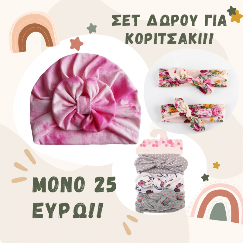 Υπέροχες κορδέλες και τουρμπάνια σε μοναδικά χρώματα και σχέδια που θα ομορφύνουν ακόμα περισσότερο τα βρεφικά και παιδικά κεφαλάκια! Τα πιο ιδιαίτερα τουρμπάνια για απαιτητικές μανούλες και μωρά με στυλ είναι εδώ! Τουρμπάνια: 80% Βαμβάκι – 20% Πολυεστέρας Σίγουρα με ένα τέτοιο τουρμπάνι θα ξεχωρίζετε σε κάθε σας βόλτα! Κατάλληλα από 6 μηνών μέχρι 2 ετών ανάλογα και με την ανάπτυξη του μωρού σας! Ένα σετ μαμά κόρη δεν θα μπορούσε να λείπει από τη συλλογή μας! Οι κορδέλες μας έχουν όλες το αγαπημένο μας μοτίβο δηλαδή το floral! Έχουν φιόγκο στο κέντρο και είναι κατασκευασμένες με μεγάλη αγάπη από εμάς για εσάς και τα μωράκια σας! Ετοιμαστείτε για τις πιο όμορφες φωτογραφίες με matchy matchy κορδέλες μαμά με κόρη! 80% Βαμβάκι – 20% Πολυεστέρας Τέλεια ιδέα για δώρο! Κατάλληλες από 6 μηνών! Κορδέλες με φιόγκους σε διάφορα σχέδια και χρώματα για να διαλέξετε αυτή που σας ταιριάζει περισσότερο! Κατάλληλες από 6 μηνών μέχρι 2 ετών ανάλογα και με την ανάπτυξη του μωρού!