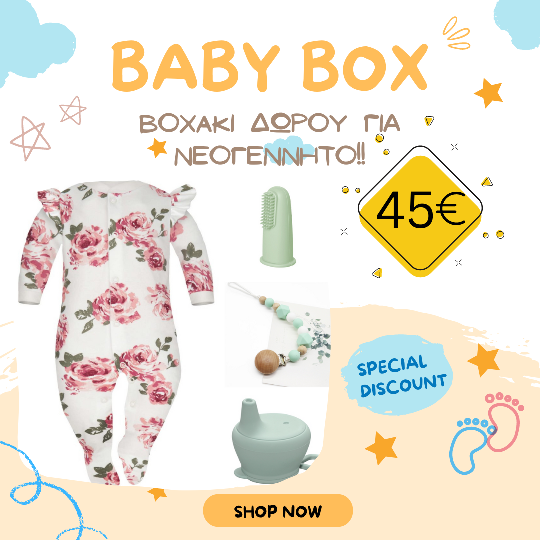 Ένα μοναδικό σετ δώρου που θα ξετρελάνει τους νέους γονείς! Εαν ψάχνετε δωράκι για νεογέννητο και έχετε μπερδευτεί σας έχουμε τη λύση! Για όλους εσάς που θέλετε να κάνετε στα αγαπημένα σας πρόσωπα ένα μοναδικό δωράκι για το μωράκι τους! Ένα υπέροχο σετάκι δώρου με απαραίτητα προϊόντα για το μωρό. Το boxaki περιλαμβάνει ένα φορμάκι νούμερο 68 (3-6 μηνών), ένα κλιπ πιπίλας από σιλικόνη (για πιπίλα ή μασητικό), μια οδοντόβουρτσα δαχτύλου από σιλικόνη και ένα καπάκι σιλικόνης με καλαμάκι (εφαρμόζει σε όλα τα ποτήρια). Την οδοντόβουρτσα θα αρχίσουν να τη χρησιμοποιούν ήδη από 3 μηνών που αρχίζουν να έχουν ενοχλήσεις στα ούλα από τα δοντάκια τους, ενώ στη συνέχεια θα μπορείτε με αυτήν να πλένετε τα δοντάκια που θα βγάζει το μωράκι σας αλλά και να του κάνετε μασαζάκι στα ούλα για να ανακουφίζεται από τα πονάκια. Το κλιπ το χρησιμοποιείτε από τη γέννηση, πάντα με επιτήρηση από ενήλικα και δεν το φοράμε ποτέ στον ύπνο. Χρησιμοποιείται και σαν μασητικό. Μπορεί να μασηθεί ολόκληρο. Το καπάκι σιλικόνης με καλαμάκι μπαίνει σε όλα τα ποτήρια, πλαστικά και γυάλινα. Όταν το αναποδογυρίσετε δεν έχει διαρροή και σας λύνει τα χέρια μετατρέποντας κάθε ποτήρι σε παγούρι όπου κι αν βρίσκεστε! Όλα τα προϊόντα μας που είναι κατασκευασμένα από σιλικόνη είναι κατάλληλα για νεογέννητο. -Το κλιπ πιπίλας, η οδοντόβουρτσα δακτύλου και το καπάκι σιλικόνης δεν μπαίνουν στο πλυντήριο πιάτων, αλλά πλένονται στο χέρι με ήπιο σαπούνι και νερό. Σημειώσεις: H οδοντόβουρτσα σιλικόνης που περιλαμβάνεται είναι στο χρώμα της μέντας.